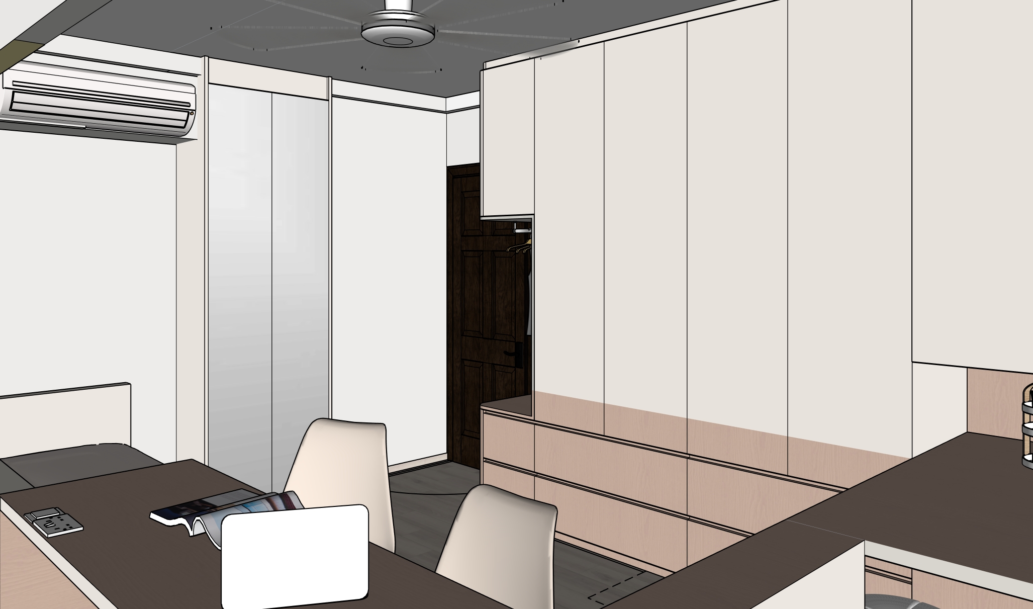 colours to remain accurate as per original given picture wood texture to be subtle drawers and all table top surface in warm beige laminate with a soft blush pink undertone and subtle wood grain texture niche in light beige microcement and only bottom till study table in muted soft pink subtle wood grains top half of carpentry in solid colour light beige and only bottom till study table in muted soft pink subtle wood grains 2 doors full height cabinet in mirror recessed 150mm height skirting ontop ceiling in off white bed headboard in solid colour light beige floor in muted light beige vinyl subtle grains ceiling fan in white walls in off white sunlight coming in from the right side of room socket switch in white edge of wardrobe to be curved