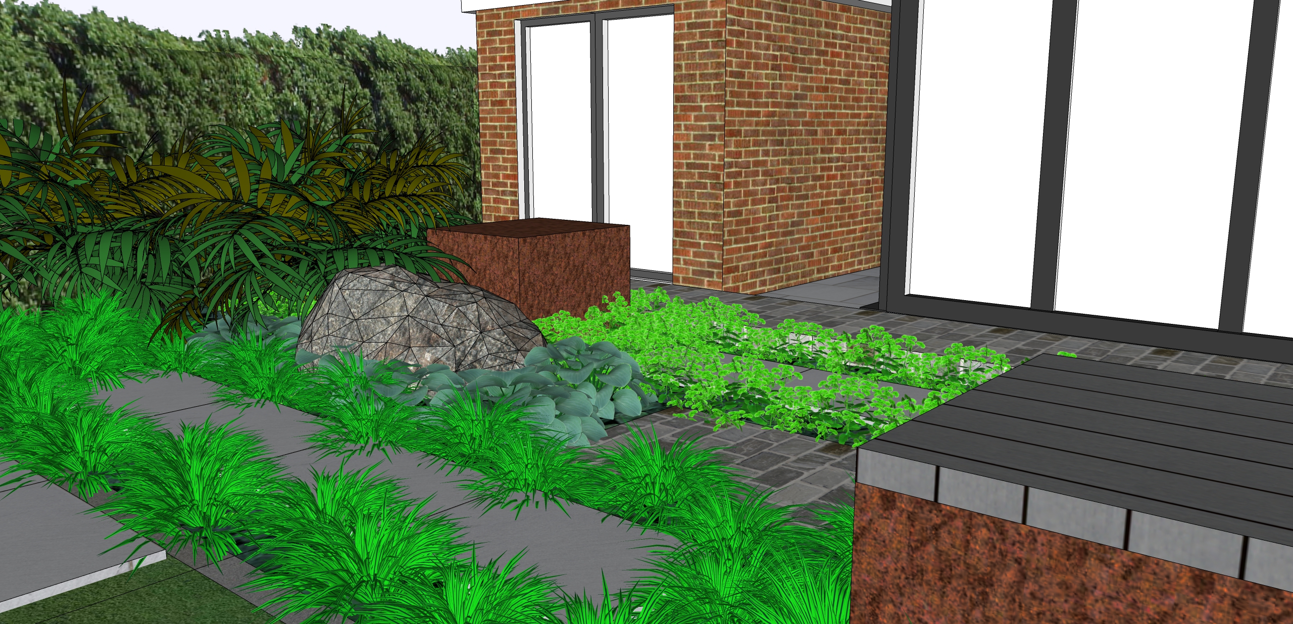 rusty steel cubes with timber top far cube is rusty steel with bubble water fountain small stone boulders stepping stone flags in planting sandstone setts top path is raised step garden in shade from shadow of house