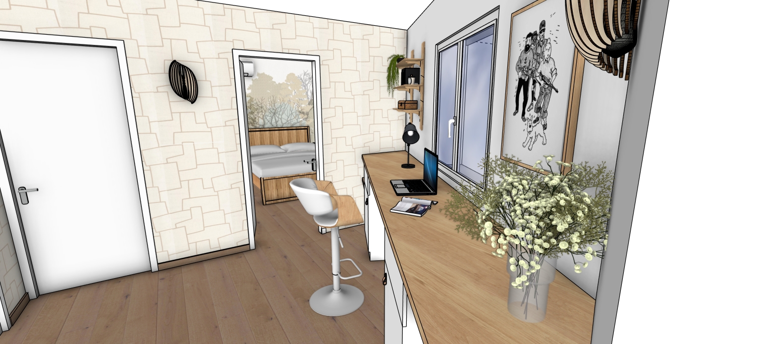 respecter integralement la geometrie et les couleurs du modele le pied de la chaise est chrome la lumi re naturelle rentre doucement par la fenetre de droite les appliques sont allumees respecter le dessin et les couleurs du papier peint panoramique sur le mur du fond