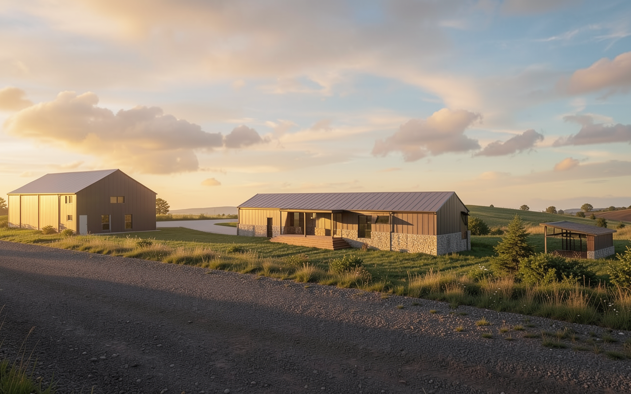 a manicured lawn in garden beds low maintenance native australian tall ferns and shrubs two small xanthorrhoea genus two small grass trees many large australian eucalyptus trees tall snow gums and tall stringybark trees to background and foreground a flying flock of white cockatoos a small isuzu d max truck