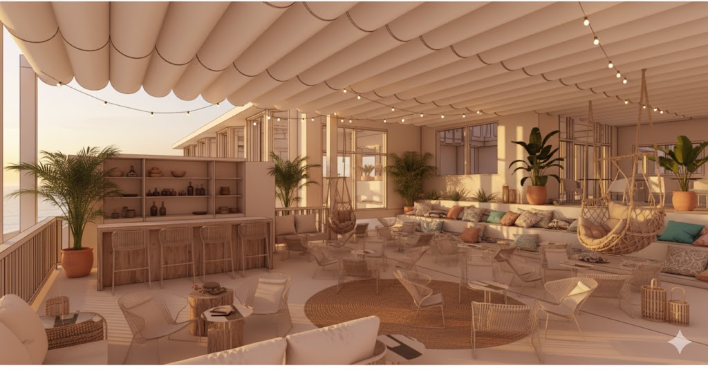 ulta cool floridian casual style outdoor lounge natural light sunset wooden deck floor subtle stripped canopy netural tones lush greeenery