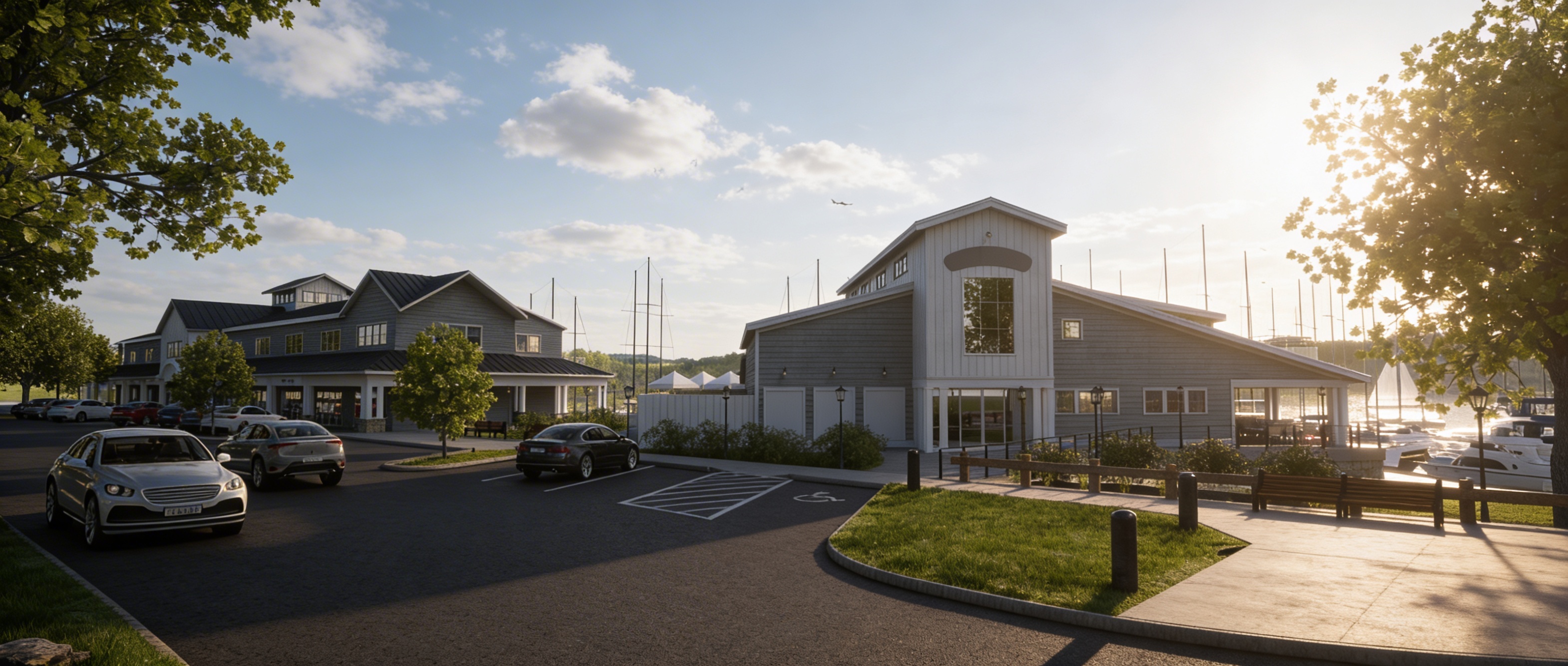 this is an image of a new clubhouse being built for a marina in southern ct this project is clad in synthetic grey shingles with a dark metal standing seam roof the center of the building is clad in vertical white clapboard the sky should be clear with some fluffy clouds and the lighting should reflect late afternoon the grass is short and well maintained and the sidewalk is brushed concrete to the left side of the image is the streetscape with cars parked in front of the building to the right the marina is visible with various docked boats the sunlight is coming from the right side of the image