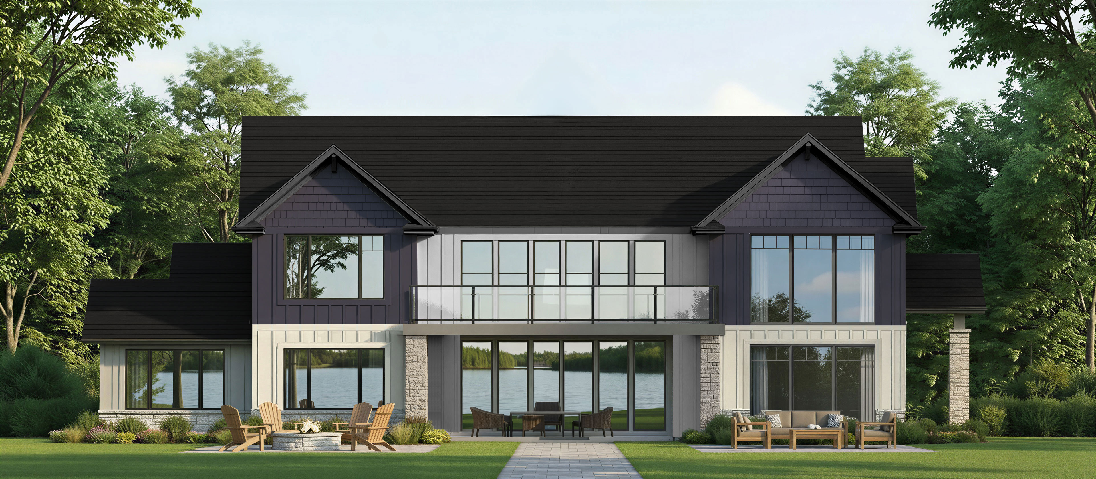 a beautiful two story house in a serene suburban setting featuring a classic facade the roof is covered in warm slate gray shingles the walls are a soft cream color with white accents on the windows and trim the large windows reflect the clear blue sky the stone details at the base and around the entrance are in earthy tones of light brown and beige lush green trees surround the house adding a touch of nature the atmosphere is peaceful and inviting with a golden hour glow illuminating the scene