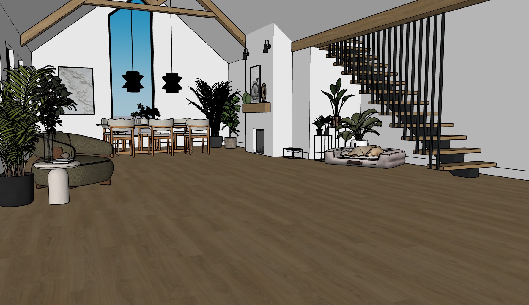 luminaire rotin mur blanc plancher de bois pale escalier bois avec limon noir barreaux d escalier noirs