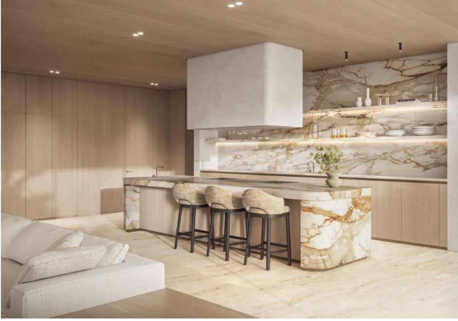 poner toda la cocina en blanco y el suelo madera heringbone y las sillas cuero