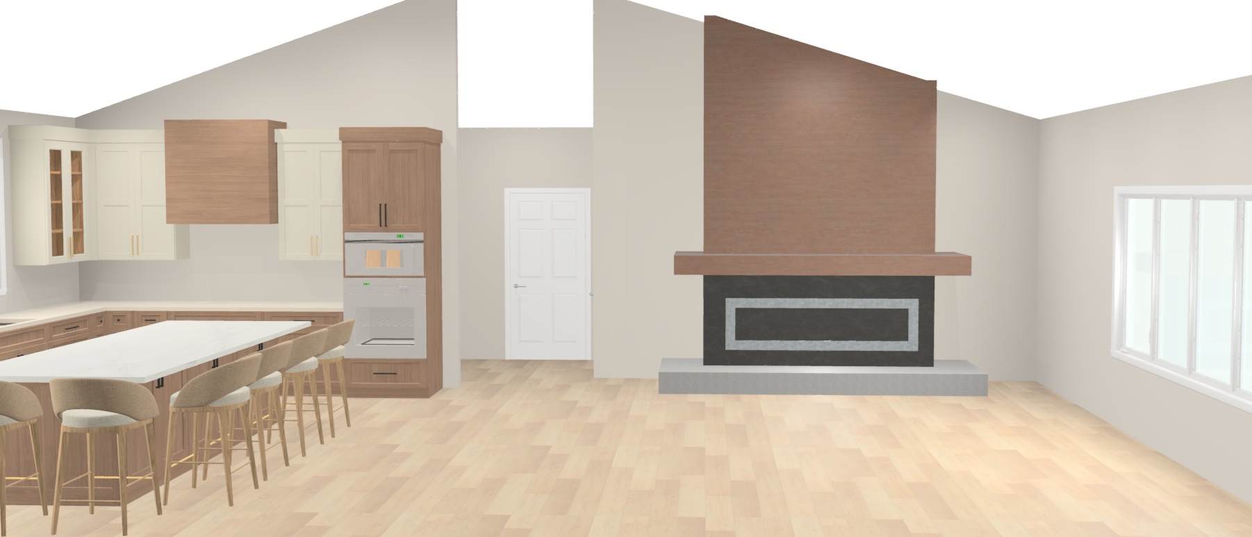 modern perspective shot warm kitchen and living room with white oak and cabinets make fireplace wood white oak with black fireplace surround add furniture and an area rug architecture