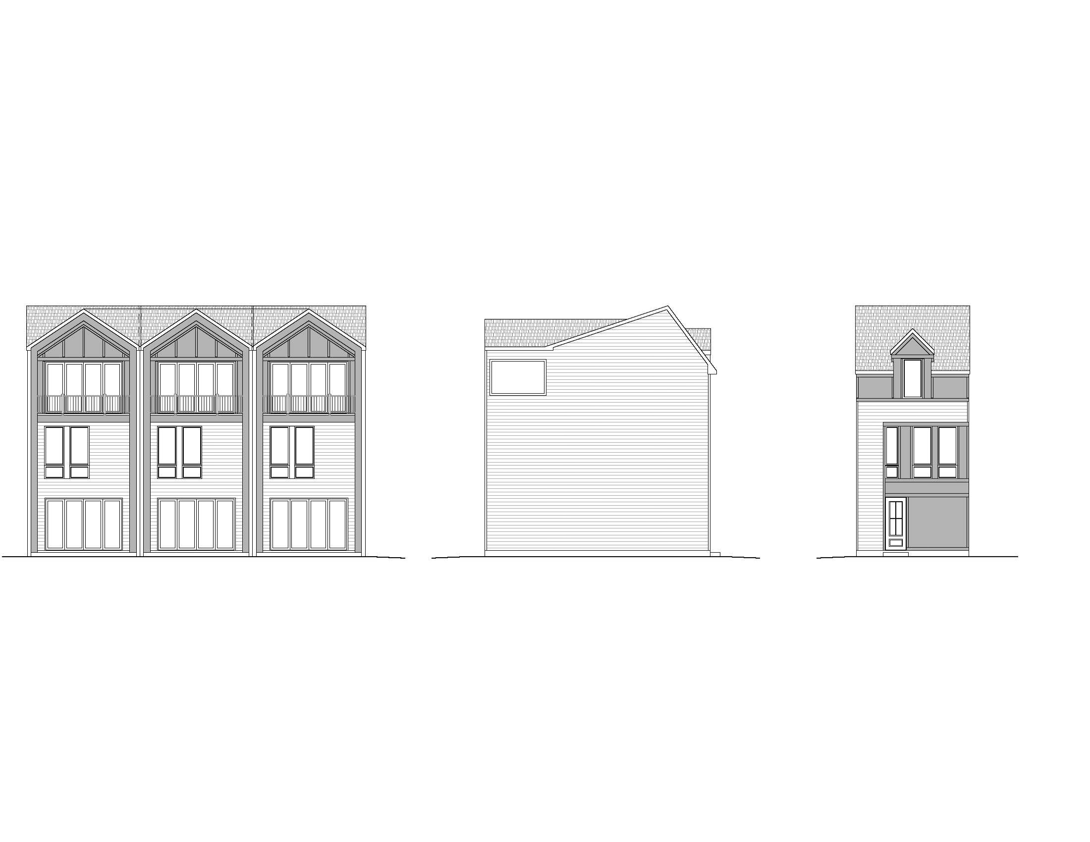 create a lifelike photo based on the architectural blueprint do not change anything structurally do not change finish materials top level is a recessed roof terrace covered with a roof the front is vinyl siding the roof is covered in architectural shingles set the scene on a bright sunny day with a few clouds make the windows frames and trim dark gray do not add any additional features
