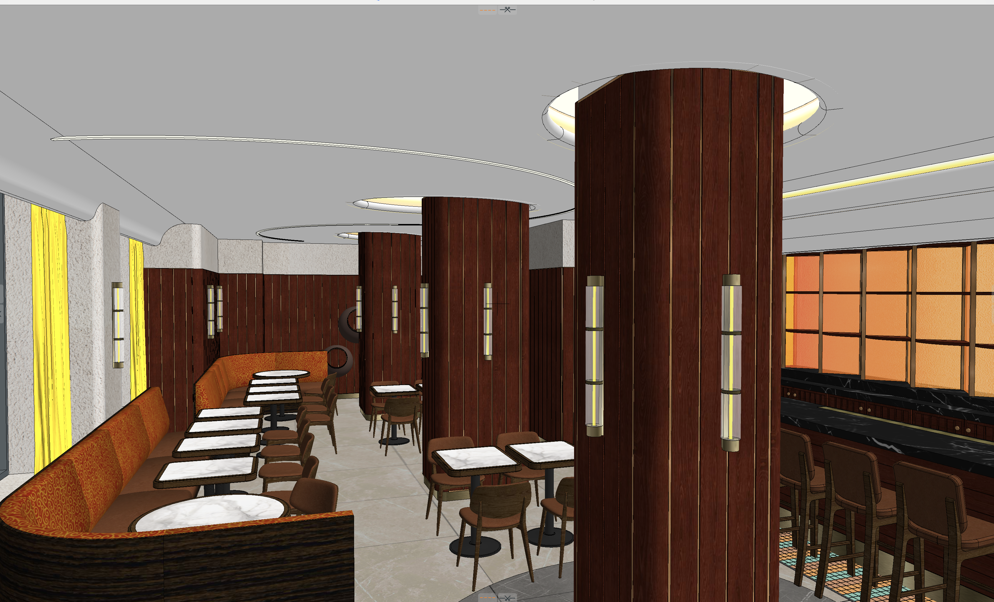 transform the provided restaurant interior image into a high end photorealistic daytime render with soft natural daylight and subtle reflective highlights while keeping everything exactly the same same proportions same booth seating layout same tables and chairs same ceiling curves same wall finishes same yellow curtains same wood panels same bar location and same spatial arrangement do not change or move any objects geometry materials colors or furniture positioning add premium table settings on selected dining tables cloth napkins elegant plates cutlery glassware and small decorative accents while keeping all furniture exactly where it is include 2 3 people positioned only at dining tables and or at the bar with a relaxed upscale resort appearance properly scaled naturally integrated and not blocking architectural features lighting should feature soft daylight with gentle reflections and mild highlights creating a bright yet warm catalog like look enhance realism with wood grain richness marble reflections brass sheen fabric depth soft shadows and crisp clarity while keeping the entire interior design exactly as originally shown