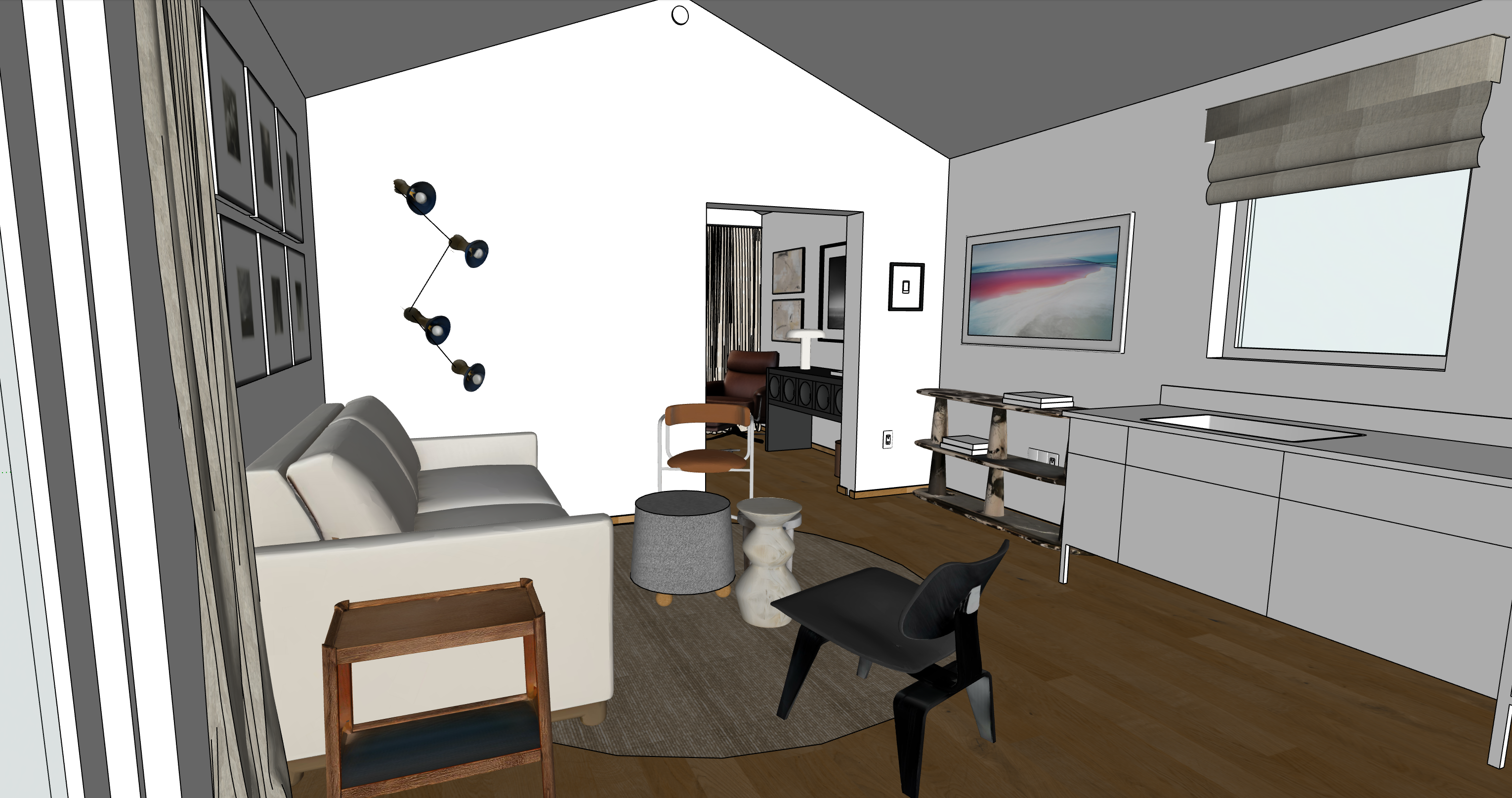 render in a realistic way with natural light raking in from the windows and door the walls are white and the floors are natural white oak the rug is a light tan woven wool in a linear pattern the window shade is light grey linen make the rug a circle the brown leather chair has a chrome frame the table lamp in the background is chrome the sconce on the wall has 4 lamp shades in black and chrome zig zagging connecting them the opening in the far back is a french door