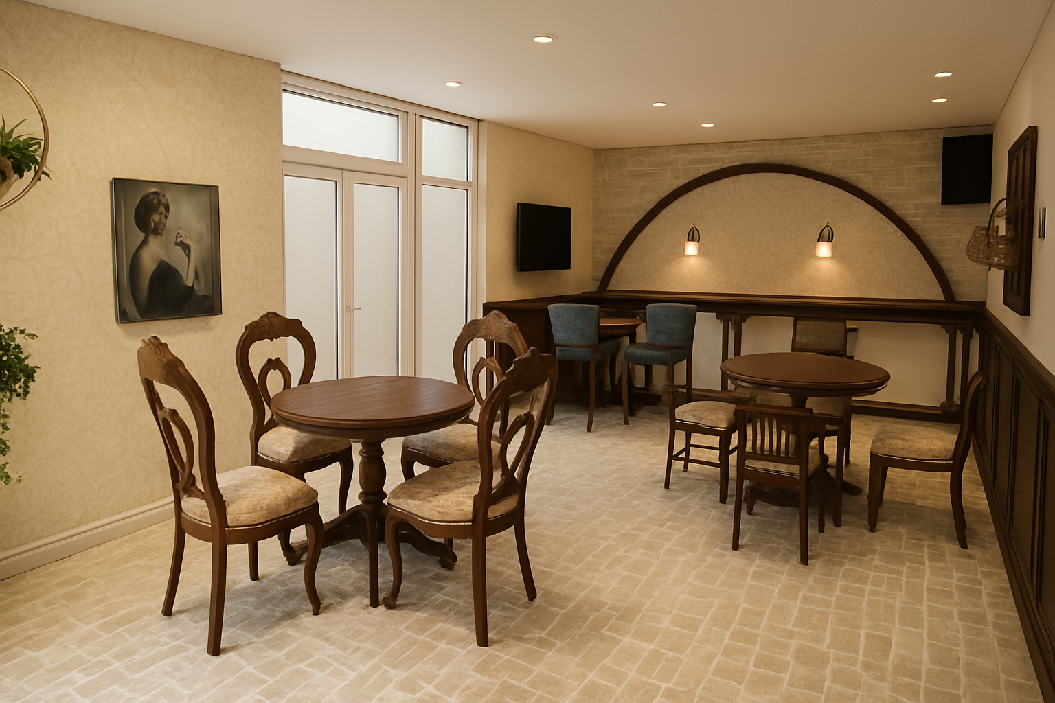add green grass with sidewalk and shrubs in the front and trees in the backround cream color board and batton red brick