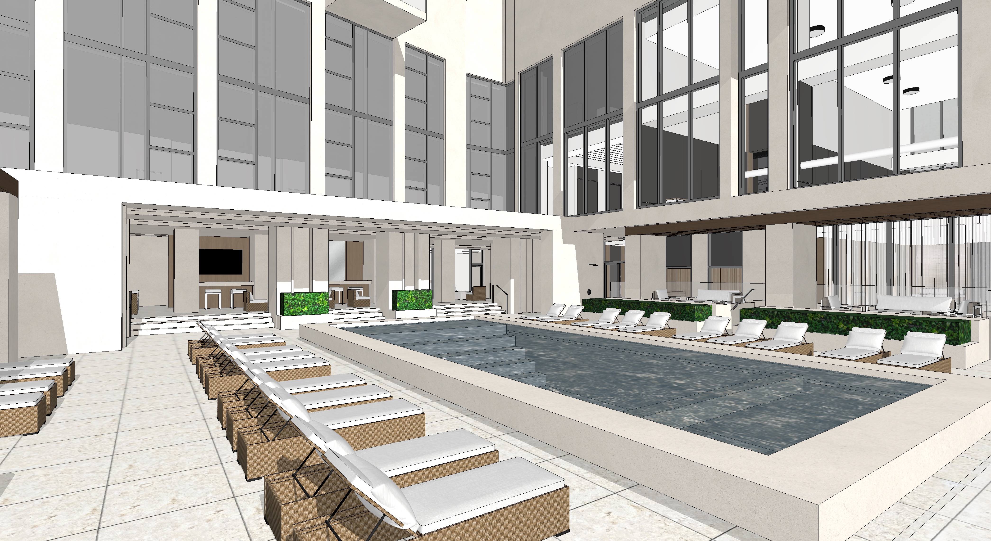 render a luxurious rooftop pool area with a modern minimalist design the pool water should be a rich azure blue reflecting the sky surround the pool with sleek white stone tiles arrange elegant loungers with rattan bases and soft white cushions symmetrically along the poolside incorporate neatyl clipped hiedges in planters for a touch of nature the building facade should have a smooth light beige finish with tall elegant glass windows the atmosphere should be serene and upscale capturing a sunny late afternoon with soft shadows for a sophisticated look