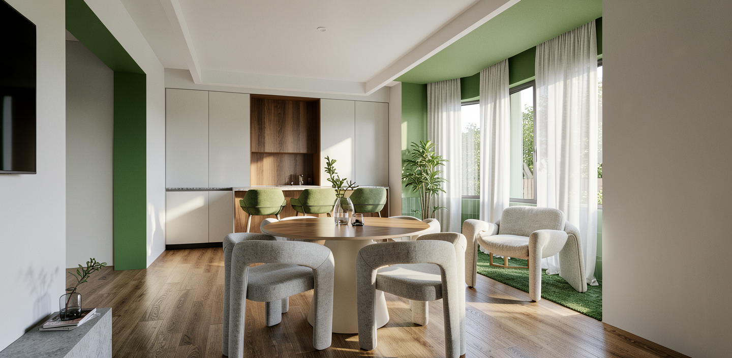 crea una imagen fotorrealista de este sketchup el suelo de color verde de la derecha son azulejos