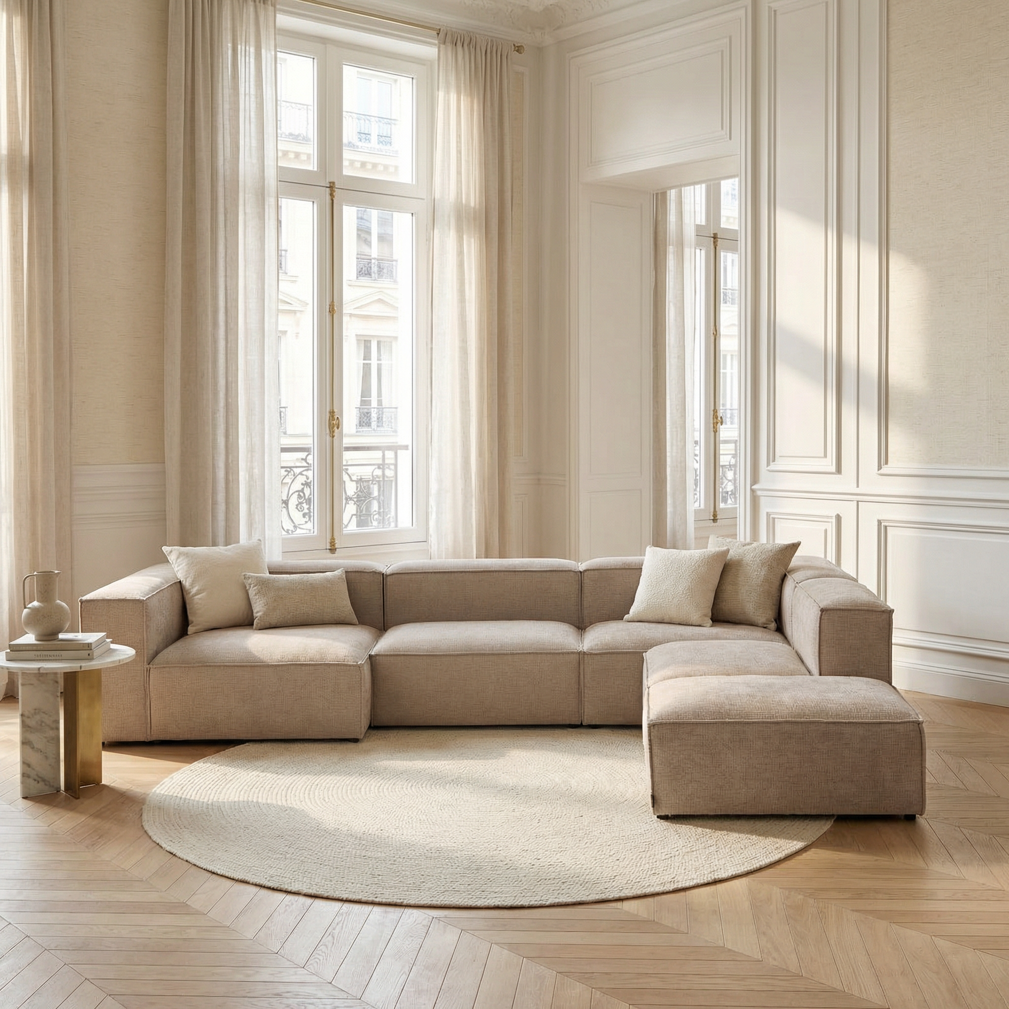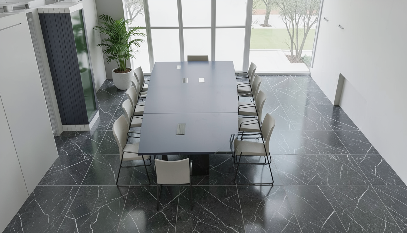 use the provided enscape render as base reference keep exact layout proportions and camera angle enhance natural lighting and refine materials add one elderly man and one elderly woman drinking coffee at table add one potted plant in corner and large framed picture on the wall in the left side of the room add a coffee machine in the kitchen and a few kitchen accesories