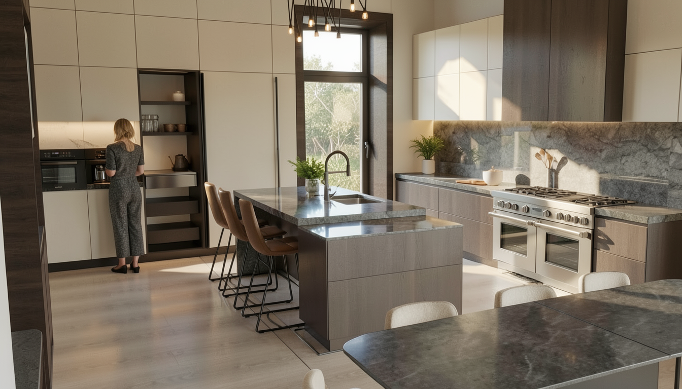 make the base cabinets hood and island cabinet a zinc metal make the upper cabinets and tall wall of cabinets a cream glossy finish