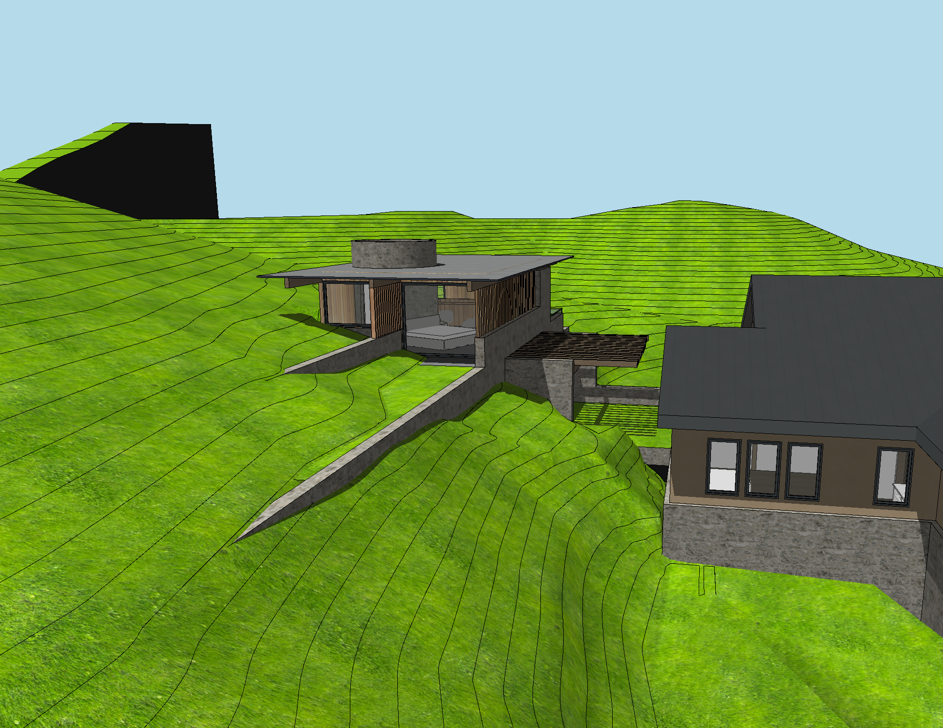 landscape hillside with sagebrush and tall wild grasses brown drystack stone walls corten standing seam metal roof add a couple people on the pool make a little light spill through the vertical wood louver system