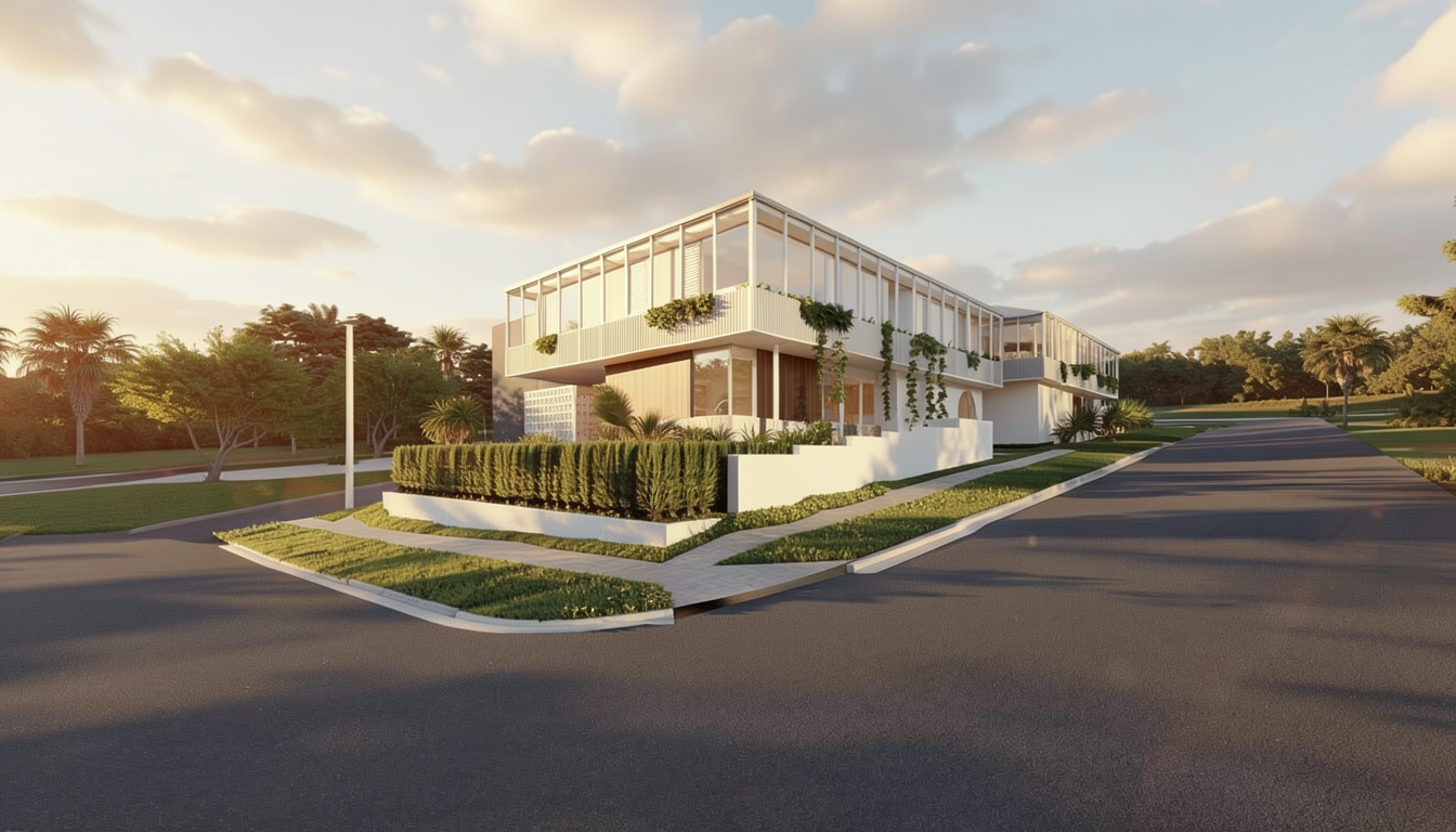 modern barn style farmhouse with a large double storey gable form clad in charred dark almost black vertical timber shou sugi ban style feature a monument or dark colorbond standing seam metal roof with a medium pitch including small dormer windows along the roofline include a full width covered veranda wrapping the front fa ade with a lower skillion style roof extending off the main structure use natural timber posts and beams to soften the dark exterior add large black framed windows and expansive glass sliding doors opening onto an outdoor entertaining area include a paved patio with outdoor furniture lounge seating and subtle landscaping with native grasses and stone edging attach a side volume with a barn style garage door or shed style extension maintaining the same dark cladding and roof material set in an australian rural landscape with dry grass open paddocks scattered trees and warm sunset lighting style photorealistic high end modern rustic cinematic lighting warm tones natural textures architectural detail