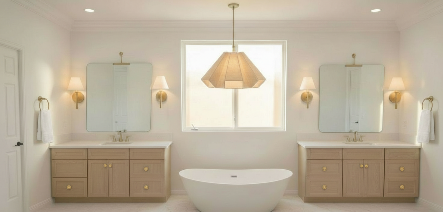 render a serene and elegant bathroom interior with a soft warm atmosphere feature a freestanding smooth white bathtub centered under a large geometric beige pendant light on either side place lightwood vanities topped with sleek white countertops each vanity includes a rectangular mirror framed in a subtle gold with matching gold fixtures add wall mounted spherical gold sconces with white fabric shades on either side of each mirror emphasize the calming ambiance with a harmonious palette of beige soft gold and white for an airy feel illuminated by gentle natural light streaming through a large window