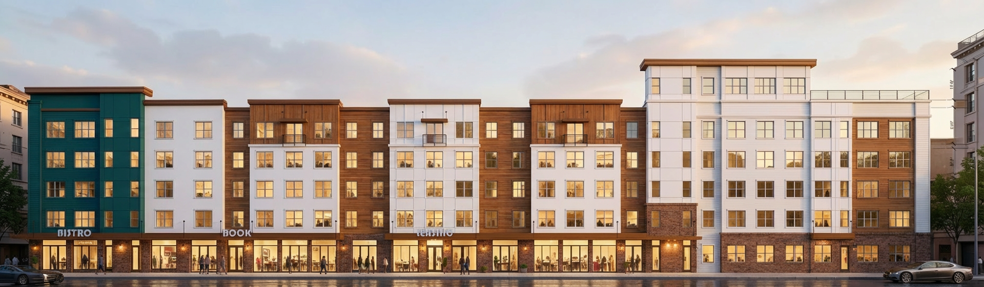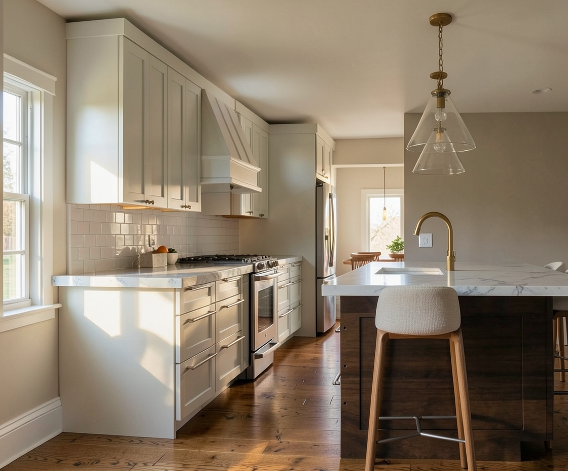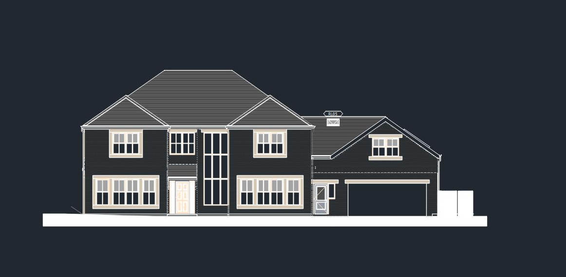 create a photo real image of this house front elevation use mixed tone red brick for the body with sandstone lintels and mullions the window frames are painted off white