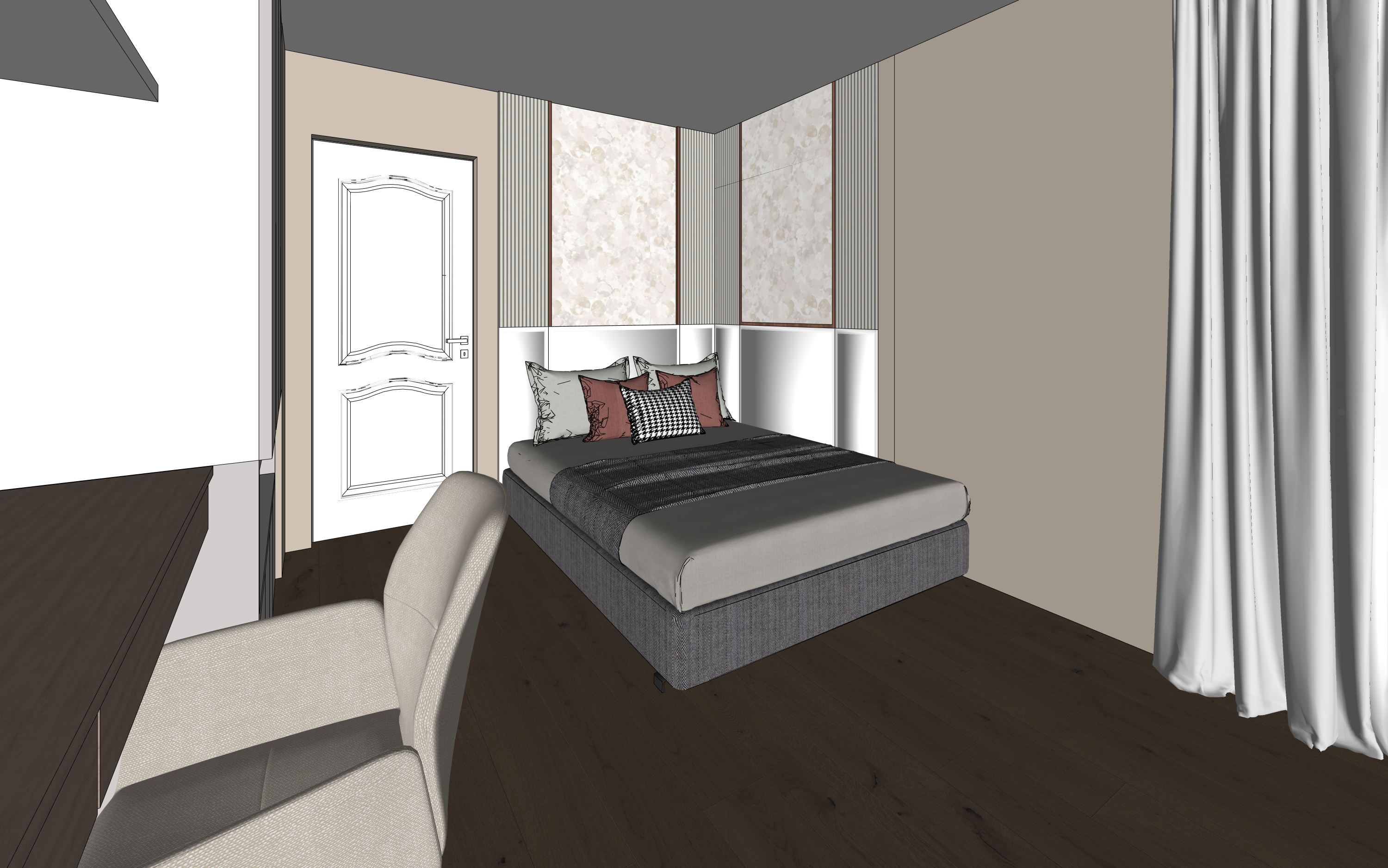 photorealistic interior render of a small modern bedroom based exactly on the provided sketchup model important do not change the geometry layout furniture design or proportions keep the exact furniture positions and architectural elements materials all cabinetry and panels must be rehau 2741l vanilla cream matte maintain the dark wood floor as in the original model design intent elegant modern interior warm lighting luxury hotel atmosphere headboard wall decorative upholstered wall panels with vertical brass accents and a central stone decorative panel exactly as in the model lighting soft indirect led lighting integrated in shelves and ceiling important corrections no ceiling cornice keep the existing door exactly as shown do not add new lamps above the door do not change the floor material make the scene brighter and elegant but keep the same furniture and architecture
