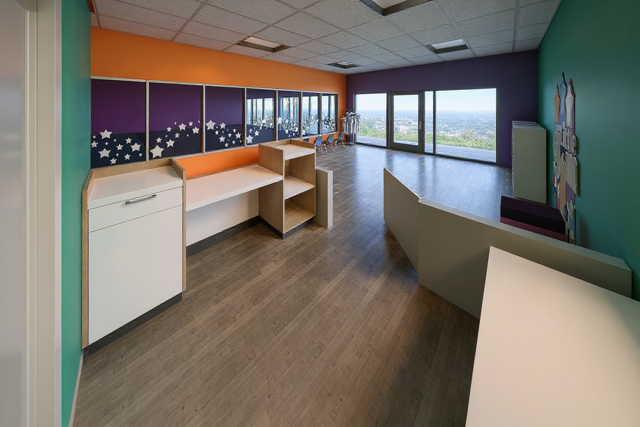 add light to light fixture make it brighter the image and change the color floor to a medium gray and add parking lot as background