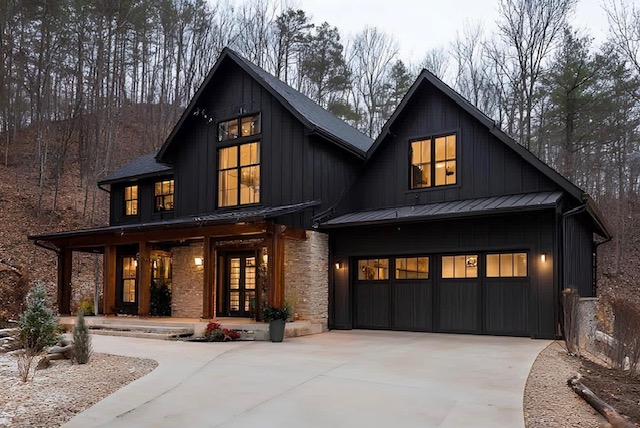 render a modern rustic house in a serene forest setting featuring a dark charcoal exterior with warm inviting yellow orange lights glowing from the windows use natural stone accents on the facade in a soft beige hue the driveway should be a smooth pale concrete surrounded by light brown natural landscape and sparse greenery the surrounding trees are tall and bare with subtle hints of muted green and brown under a slightly overcast sky creating a cozy and tranquil atmosphere