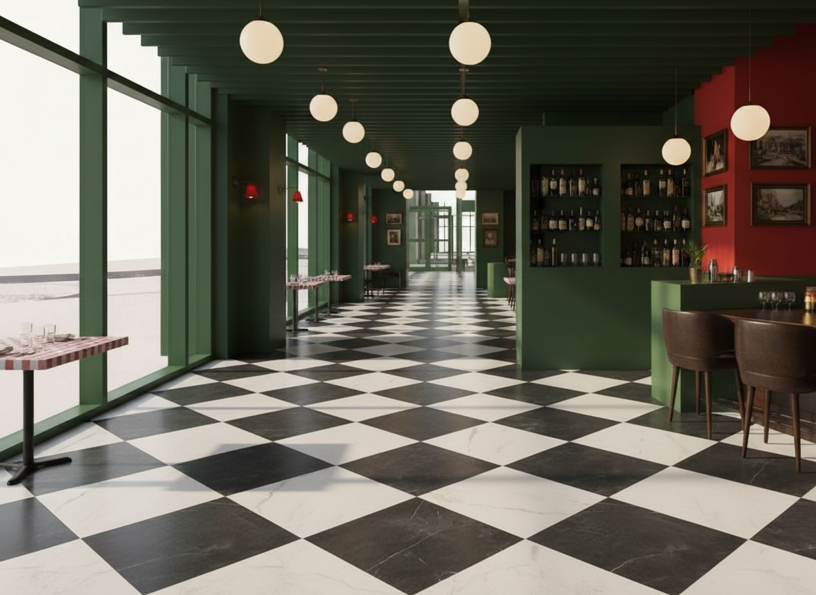 add people both men and women in cool clothes add tables that match design aesthetic along window wall add lush urban park outside of windows