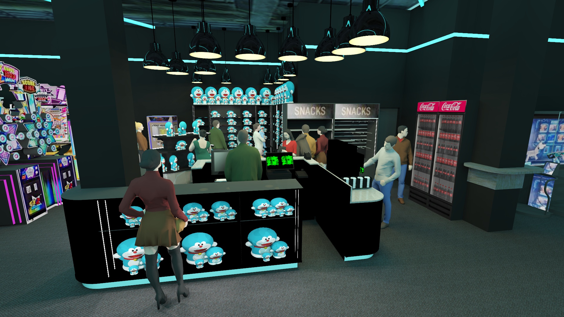 an arcade and gaming hall the machines glow brightly black walls and a black ceiling the floor covered in dark gray carpet turquoise light lines on the ceiling and turquoise lighting under the furniture create a photorealistic effect