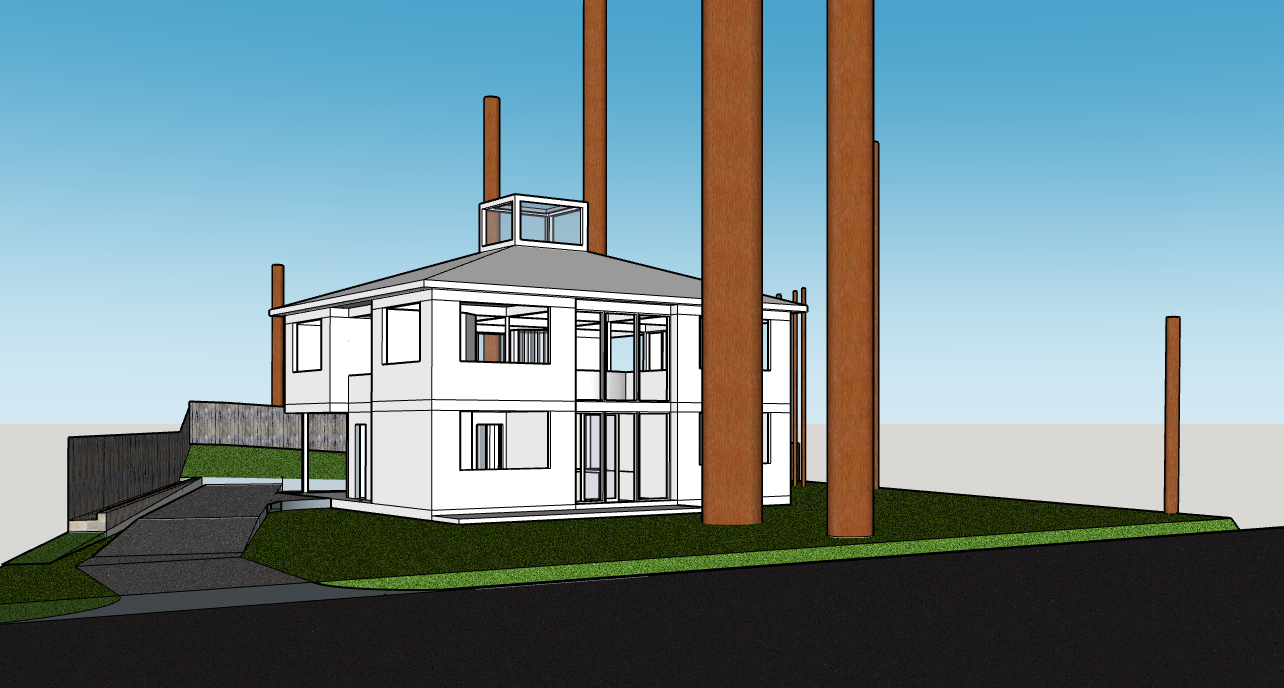 modern four square style vertical wood siding standing seam metal roof wild grasses front yard large trees