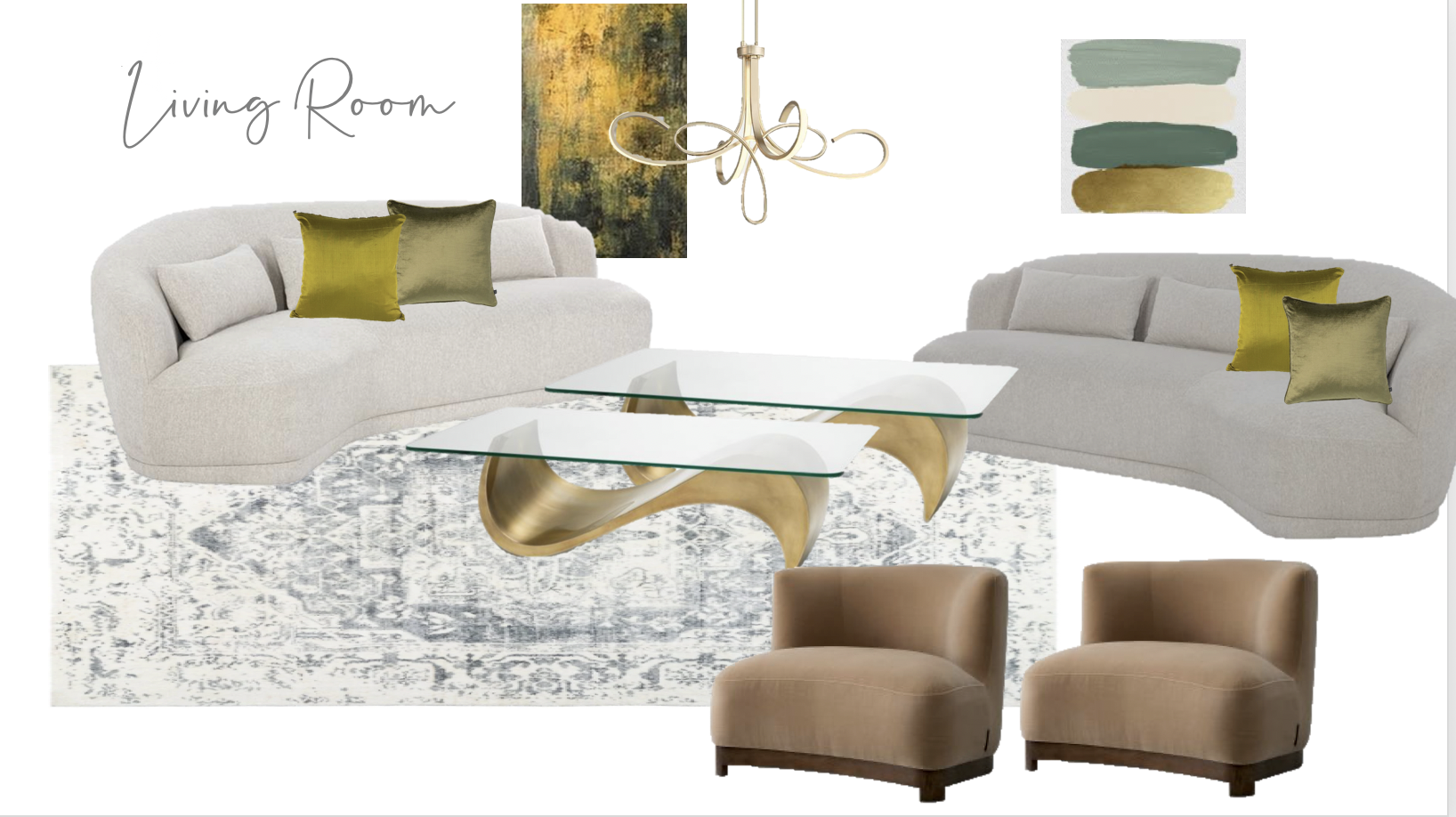 exterior shot rustic living room interior with a warm inviting atmosphere wide oak hardwood floors with a natural wood finish adding a touch of elegance large windows with dark mahogany frames allowing soft diffused daylight to fill the room stone fireplace slightly off centre towards the left with varied gray and beige stones adding texture walls painted in off white ceiling lights emit a soft white glow enhancing the room s coziness furnish the room using the mood board as reference with two sofas both off white in colour sitting on a luxurious grey patterned rug two coffee tables iwith sculptured gold bases and glass tops are centred on the rug between the sofas two tub chairs complete the conversation area and face the fireplace satin scatter cushions two per sofa in two shades of olive green are added to the off white cushions on the sofas surrounding snow covered landscape visible through the windows creating a serene and peaceful ambiance