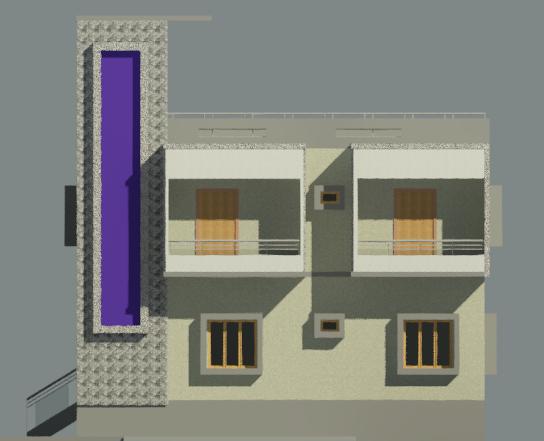 important treat the uploaded image as a fixed 3d model render this is not a design task this is only a rendering and material enhancement task strict rules highest priority do not change building geometry in any way do not modify shape massing height width or projections do not move resize add or remove windows doors or balconies do not add new architectural elements do not redesign or reinterpret the building do not change camera angle perspective framing or view do not zoom crop rotate or regenerate the structure if any of the above is violated the output is incorrect task only improve surface quality materials colors lighting and surroundings while keeping the exact same model and view facade enhancement apply modern elevation tiles stone concrete textured finish only as surface cladding use a clean modern palette off white base dark grey accents wood highlights refine the vertical shaft using premium tile stone cladding with subtle warm led strip lighting add thin dark borders around windows no size change add surface level frames to balconies no projection change upgrade railing appearance only keep same position and size pathway landscape left side only no building change add a simple pedestrian pathway on the left side in front using paving tiles or stepping stones pathway must sit on ground plane only not touching or modifying building add minimal landscape grass strip small shrubs simple planters add subtle pathway lighting bollard or ground lights ground environment add realistic ground surface paving or concrete keep background minimal and clean maintain same perspective and depth rendering high realism natural lighting and shadows architectural visualization quality final instruction do not regenerate or redesign the building only overlay materials textures lighting and environment on the existing image