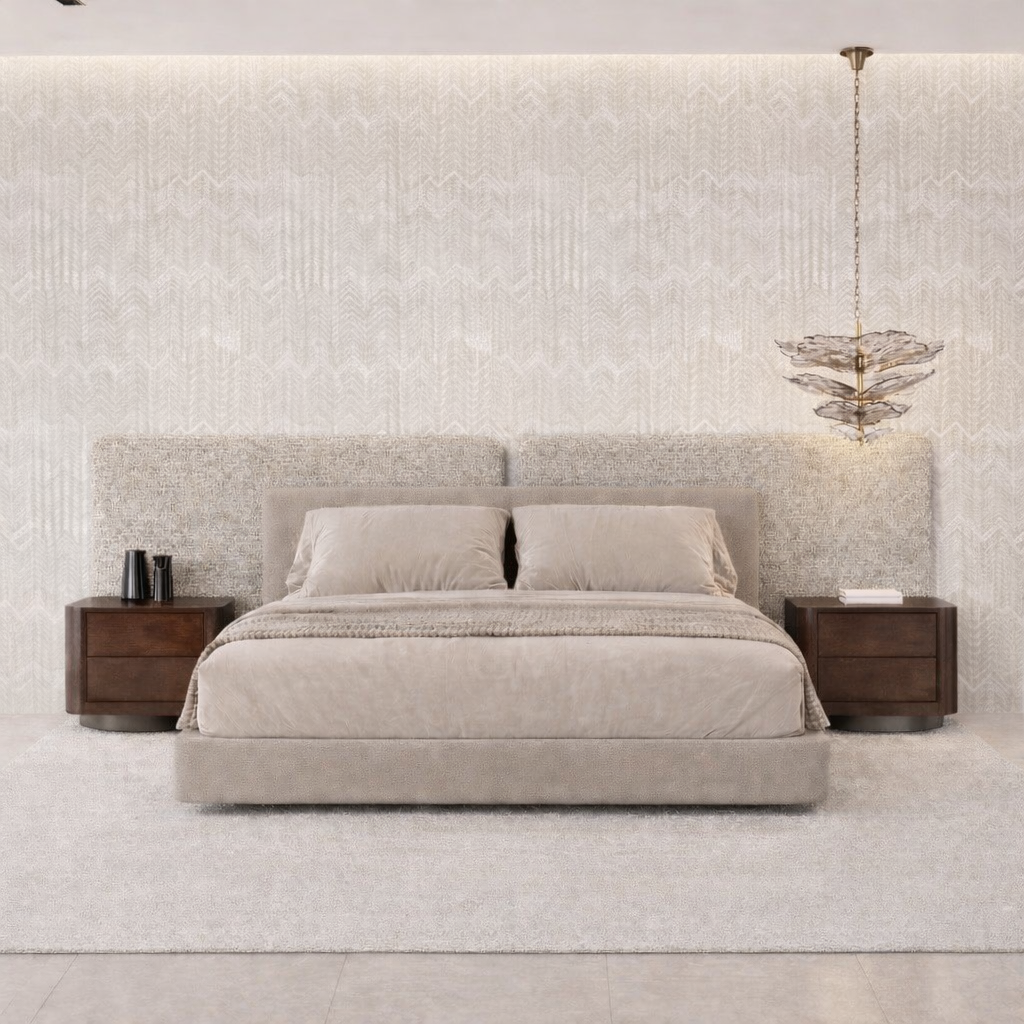 add a bench baule at the end of the bed with the same fabric as the 2 big pieces of the headboard dont change anything else keep exact shapes