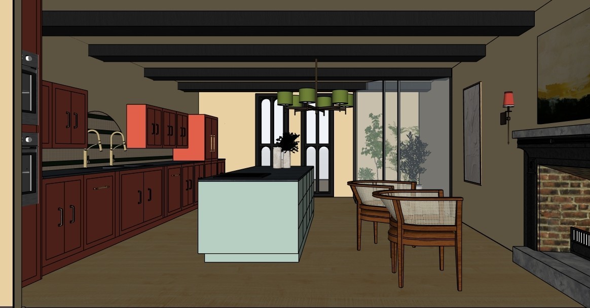 make a realisitic rendering of the sketch up image of a kitchen make the walls in farrow and ball dorset cream the cabinets in farrow and ball harissa and the island in farrow and ball teresa s green the countertop should be belgian fossil limestone the ceiling light fixture is the nickey kehoe quad arm beldi the tile pattern behind the sink should be a butter yellow and forest green