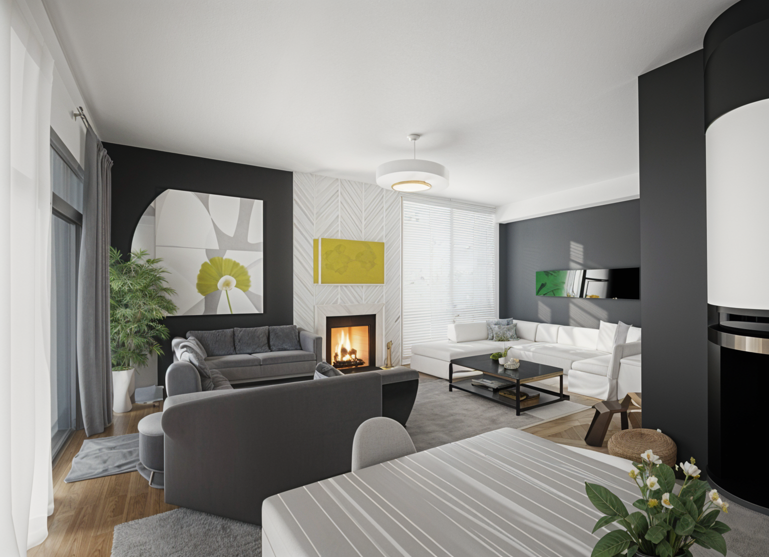 modernist interior shot modern living room with a cozy yet elegant atmosphere large white sectional sofas provide a clean and inviting seating arrangement juxtaposed with a rich brown chevron wooden design feature around the fireplace the walls seamlessly transition from a soft white to a dark charcoal gray enhancing the room s depth a sleek metallic arc floor lamp illuminates an area near the plant which adds a touch of green to the space the wooden coffee table and side table offer a rustic charm paired with a deep brown dining table that brings warmth overhead a contemporary circular light fixture casts a soft glow bright magenta orchids rest on the dining table adding a pop of vibrant color the rug beneath the furniture is a subtle gray complementing the neutral palette natural light filters through the floor to ceiling windows accentuated by dark curtains creating a perfect balance of light and shadow architecture