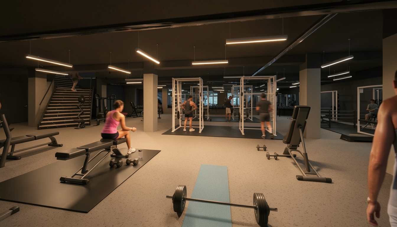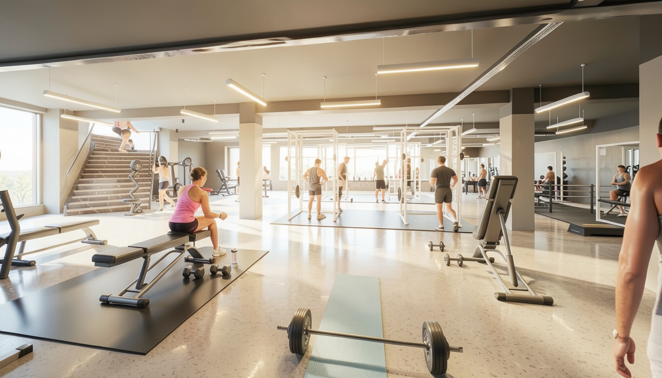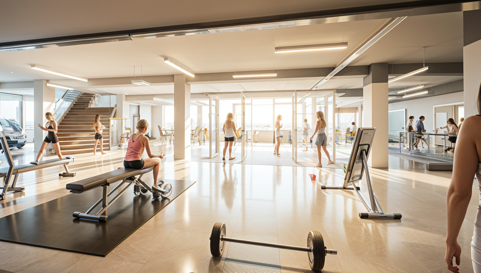 high end gym with light color scheme