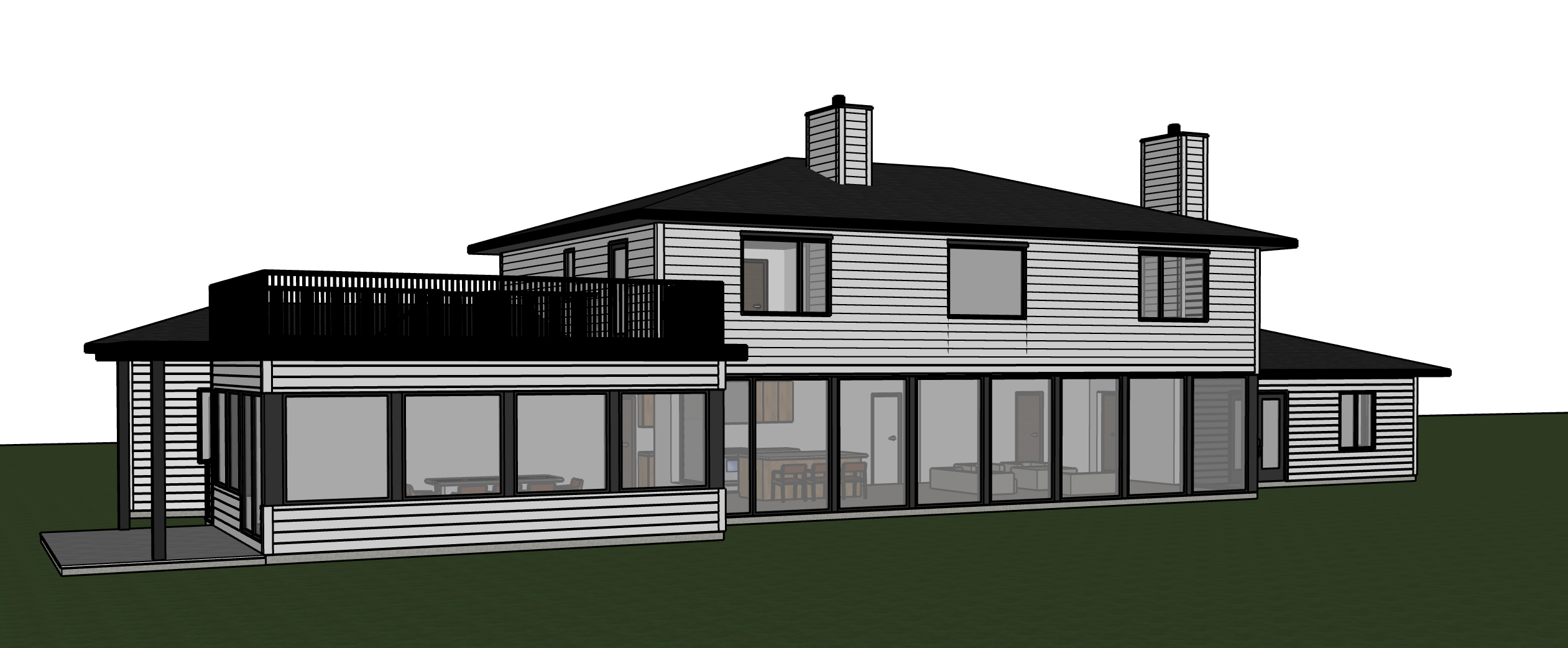 watercolour rendering no changes to architecture in image provided white siding for exterior roof are black add some subtle landscaping local to qc forest in background railing in model is black iron rods do not add in any additional railings not already in the model do not add any pathways this is the rear side of the house show grassy yard make windows and glass doors opaque so we don t see inside of house make it so they are not see through make landscape more rocky with gravel in front of floor to ceiling windows