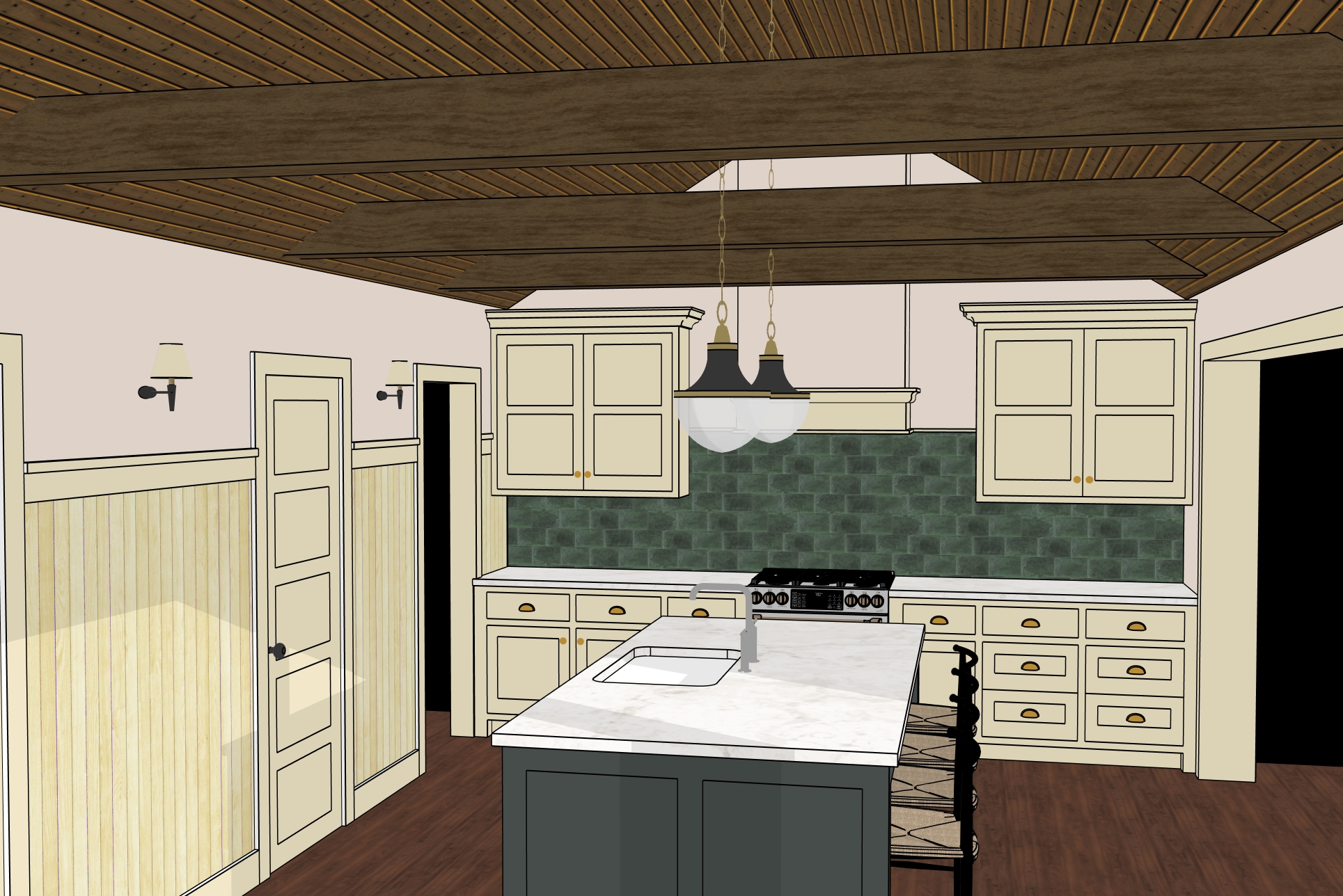 show me this rendered more realistically keep the cabinet design and colors the same keep the proportions of everything the same and the perspective add a person make it more realistic and do better lighting and add accessories it should look and feel like a devol kitchen