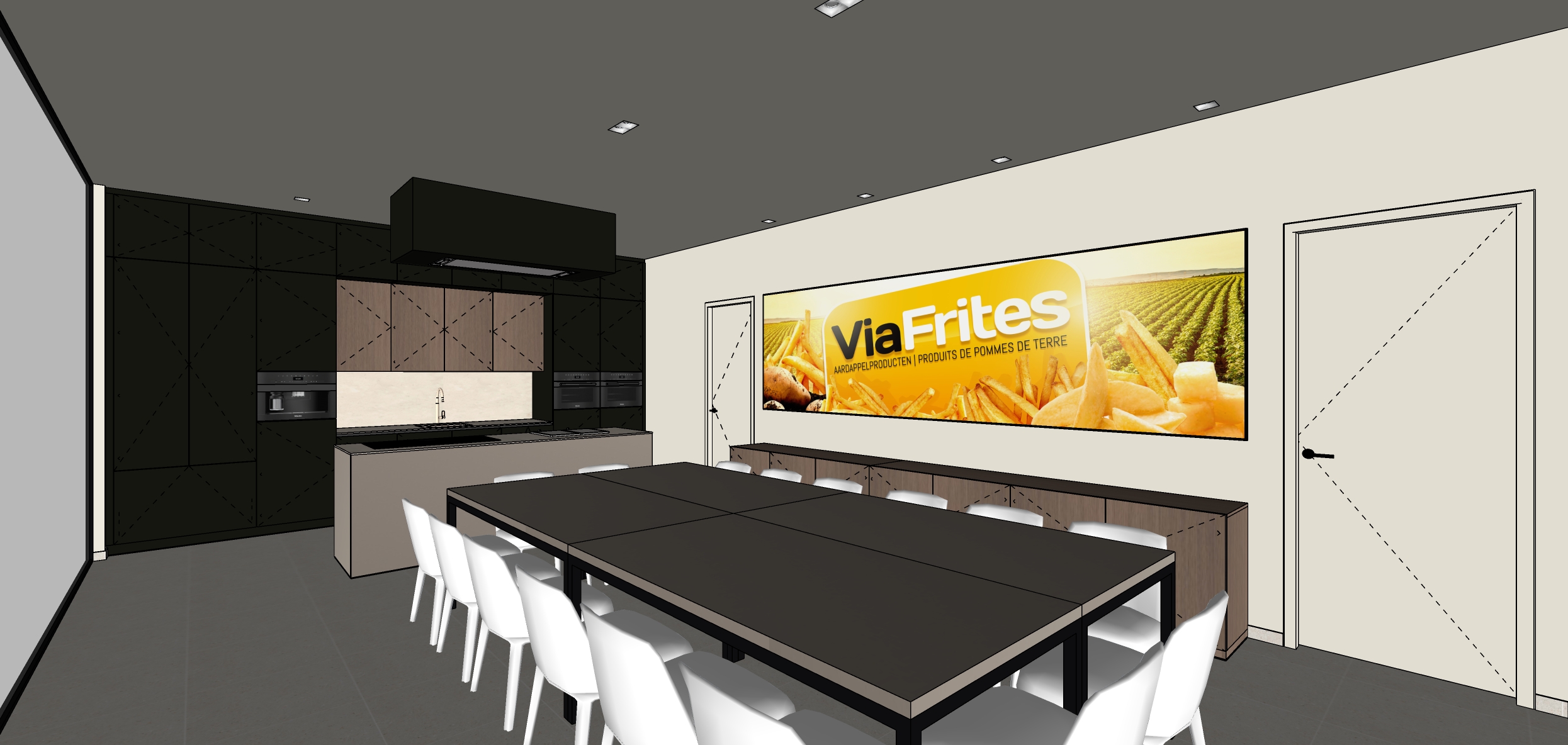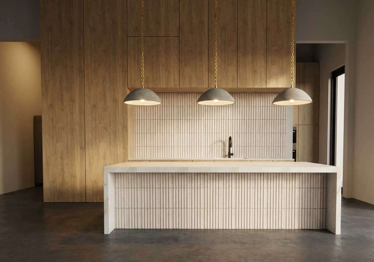 transform the interior image into a high end photorealistic render with cleat atmosphere soft glowing highlights and relaxed upscale coastal energy while keeping everything exactly the same with the same proportions same materials same positions same lighting the chairs must be in black leather a little more brightness may be introduced into the room the tall cabinet wall and canopy including the extractor hood may remain as they are the cabinets at the island are in a taupe color unilin maester oak ou827 just like the tabletops the back of the island is a solid panel with no doors the worktops are in hi macs aurora bisque m613 and must be 12 mm thick