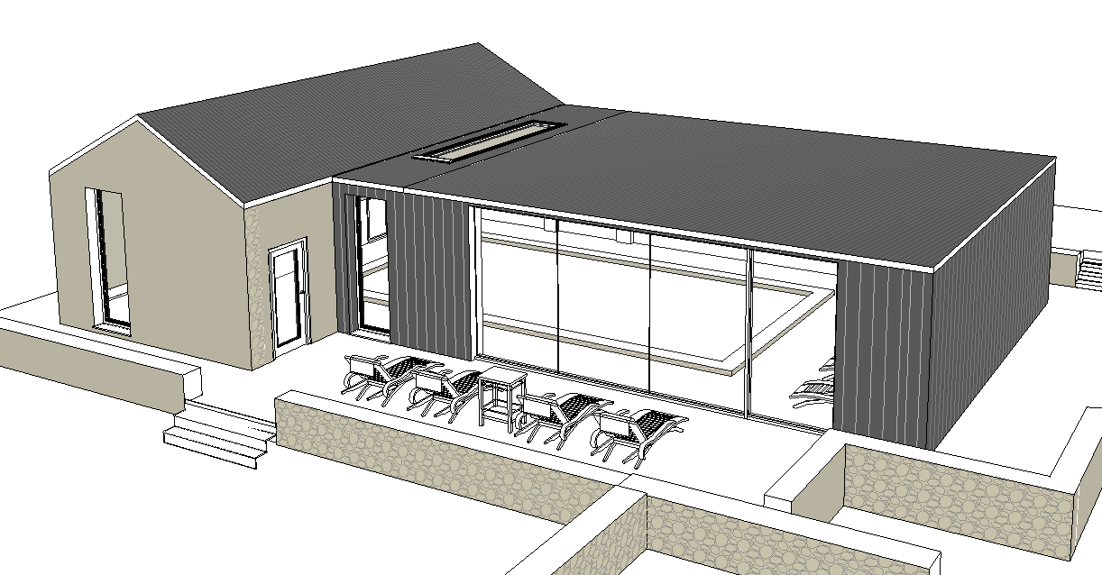 a pool house made from stone and black vertical timber cladding set within a paved garden ultra realistic render