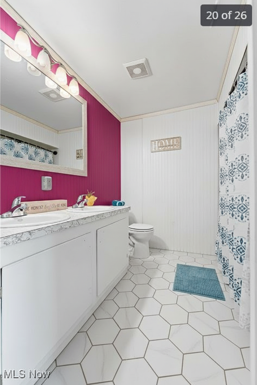 update this bathroom to a more popular design with new floor tiling and magenta painted walls include a towel shelf that goes overtop of the toilet replace the wall art with a framed photo add a bath mat replace the shower curtain with a floral shower curtain