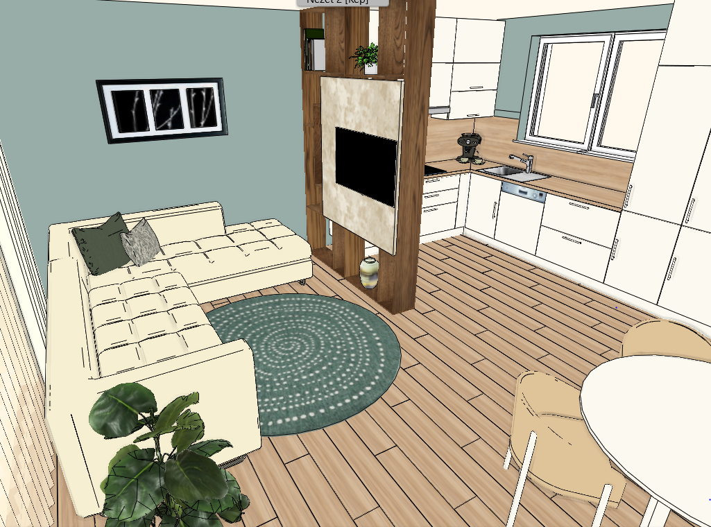 interior shot please make the picture have a nice scandinavian feel the kitchen is matte white without handles with a natural oak worktop and backsplash the floor is natural oak laminate the sofa is soft beige the wall is rosemary branch color the dining table is white surrounded by round beige dining chairs with a fine fabric the window overlooks a green landscape