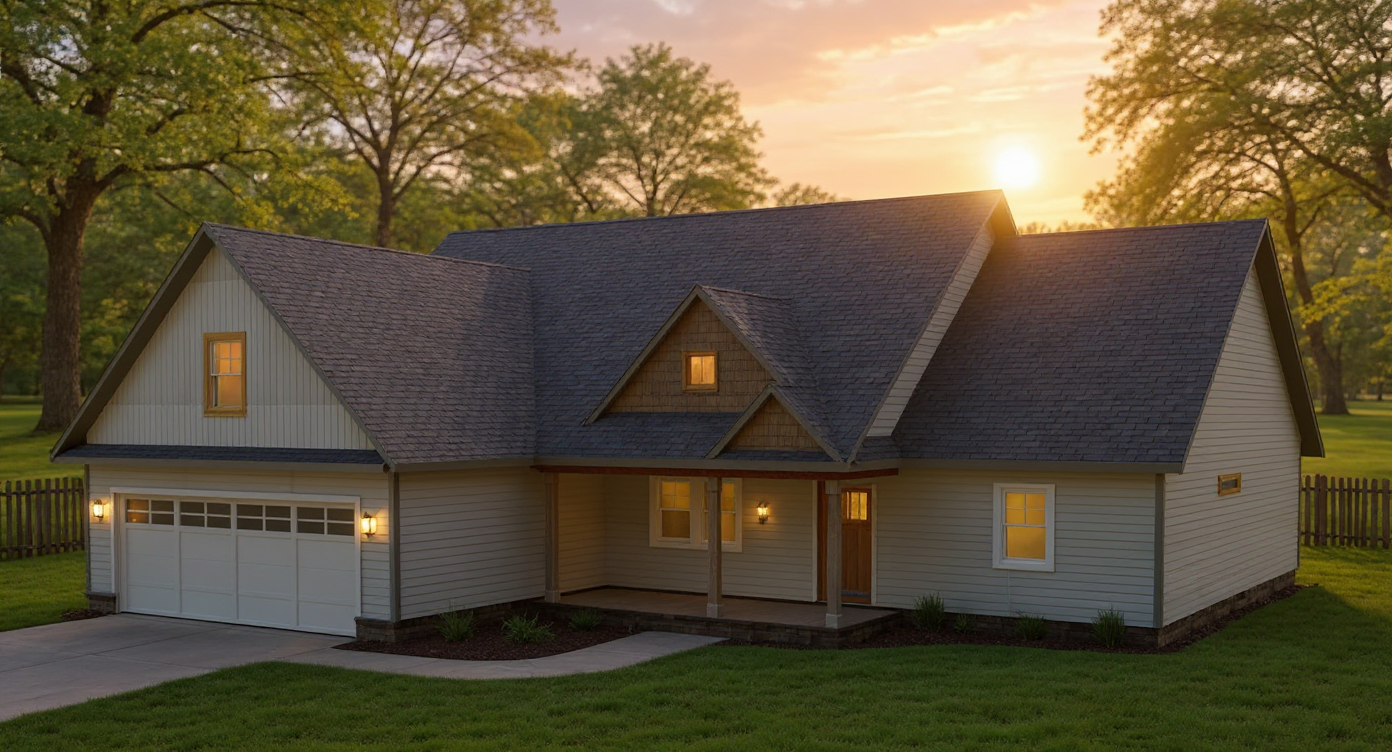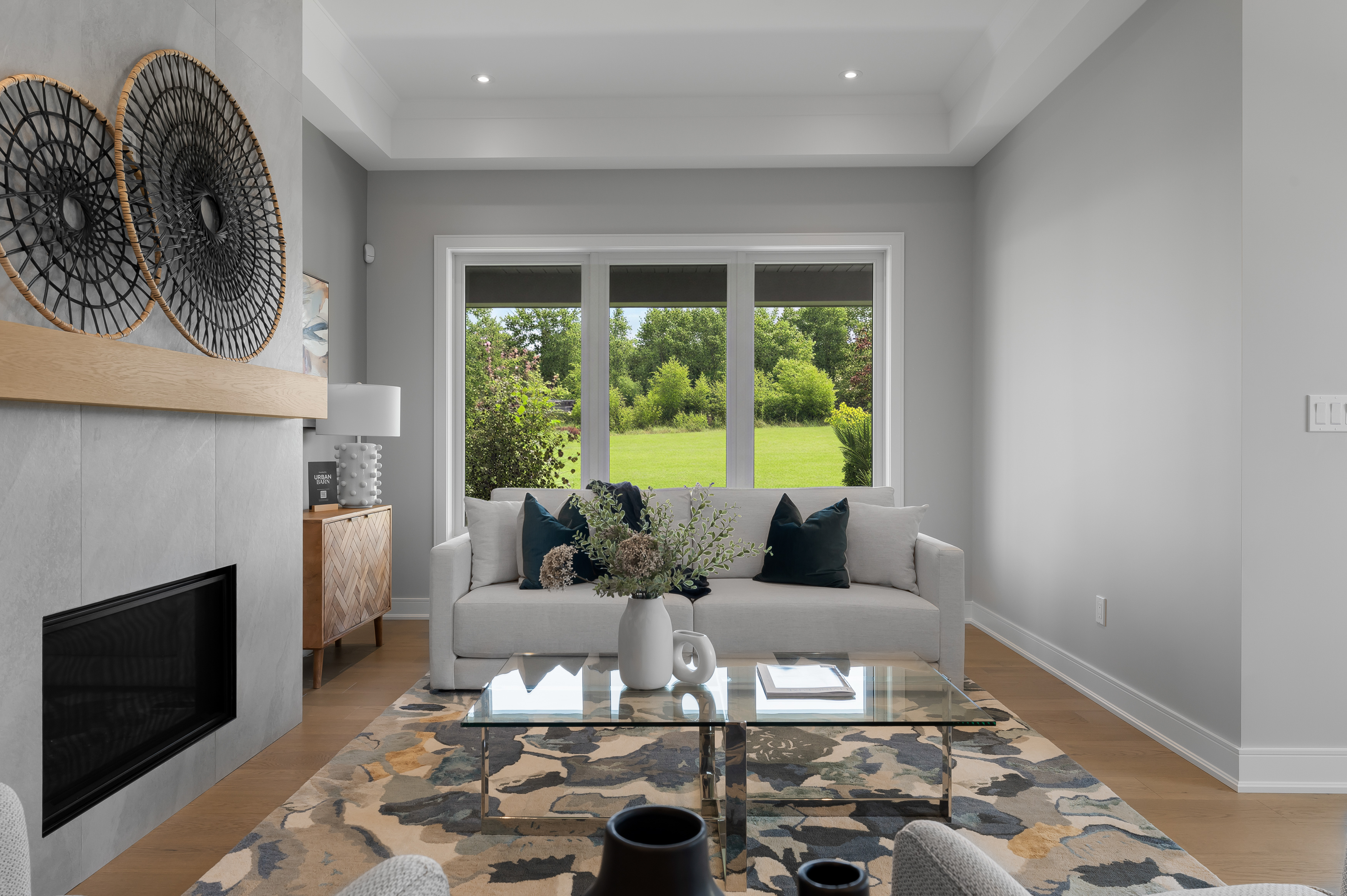 retain the structural elements of the home add green grass landscape through the windows blue sky few small trees far away
