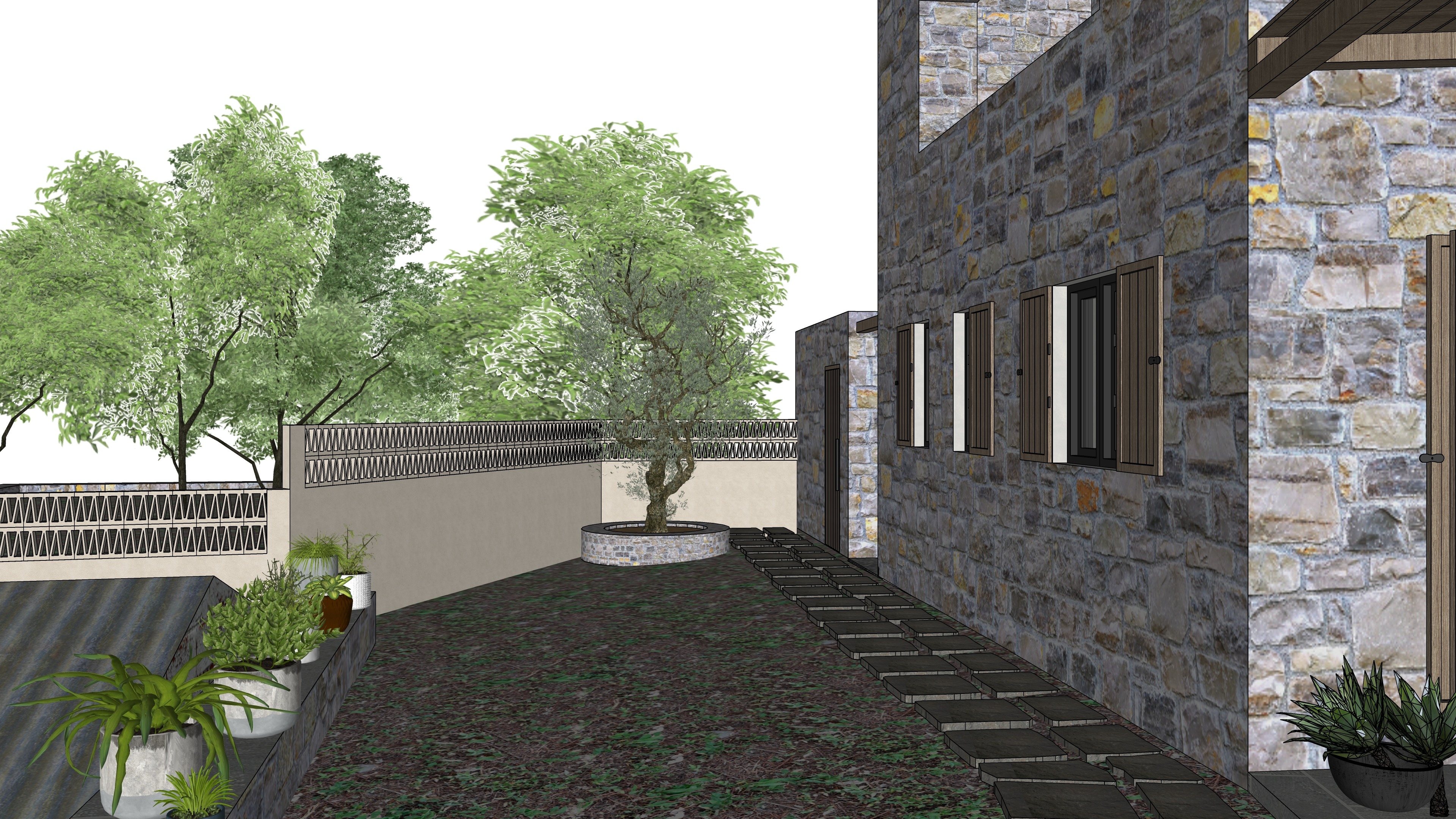 main prompt this is a house in thassos island by the sea the window frames are dark grey and the shutters are medium oak wood negative prompt do not change materials do not change geometry
