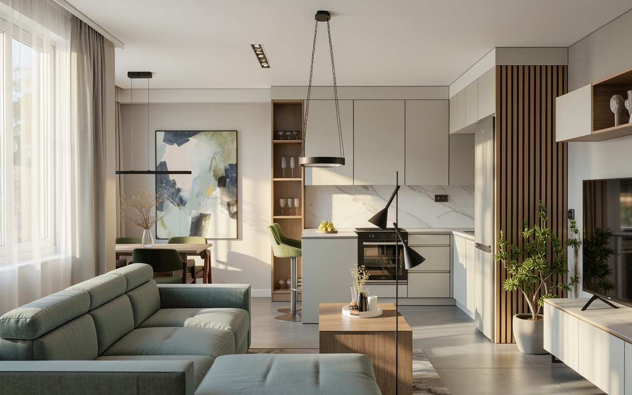 make photo realistic with natural day light there is difference between upper and down kitchen elements upper elements from camera corner are lighter then others