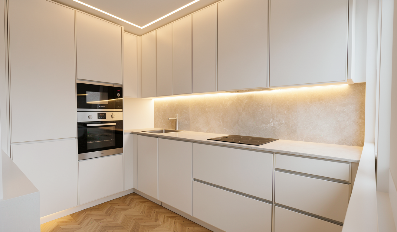 el mobiliario lleva en las puertas un enmarcado tipo moldura finita recta de 1 cm perimetral de mismo color que el resto de la puerta esta moldura sobresale de la puertas 1 cm y es del mismo tono que el mobiliario