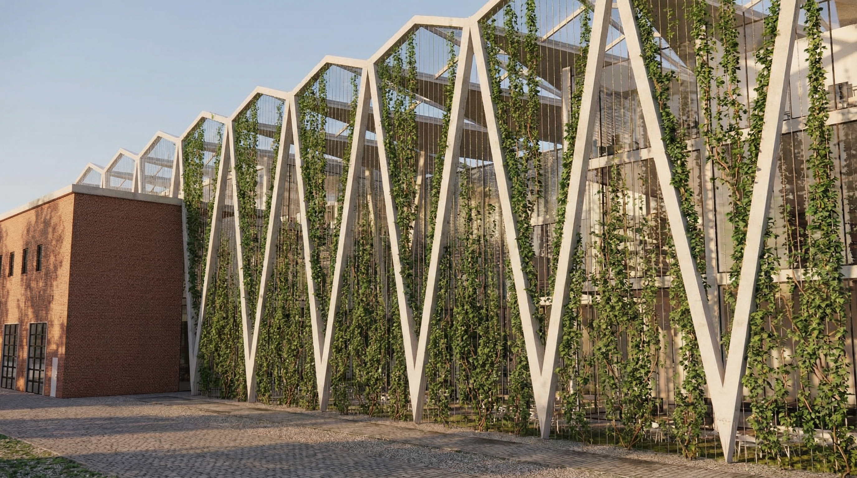 add medium dense climbing vines only on the vertical cable lines cover every cable from top to bottom including the cables above the brick volume do not place vines on the glass on the structural frames or on any wall surface vines should be straight continuous and attached strictly to the cable lines
