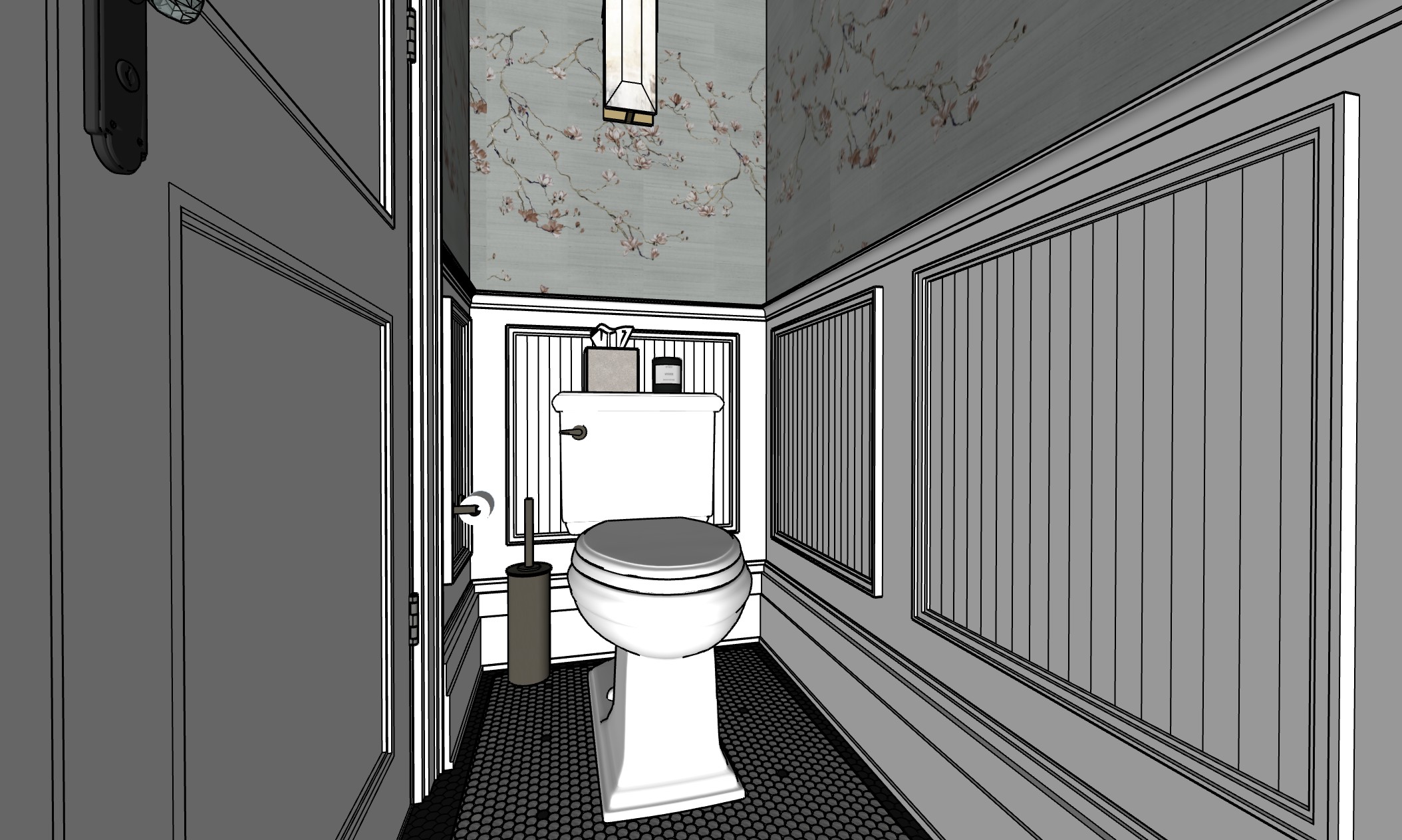 make the floor white instead of gray keep the black boarder and the black dots put the door and all the trims and paneling white not gray