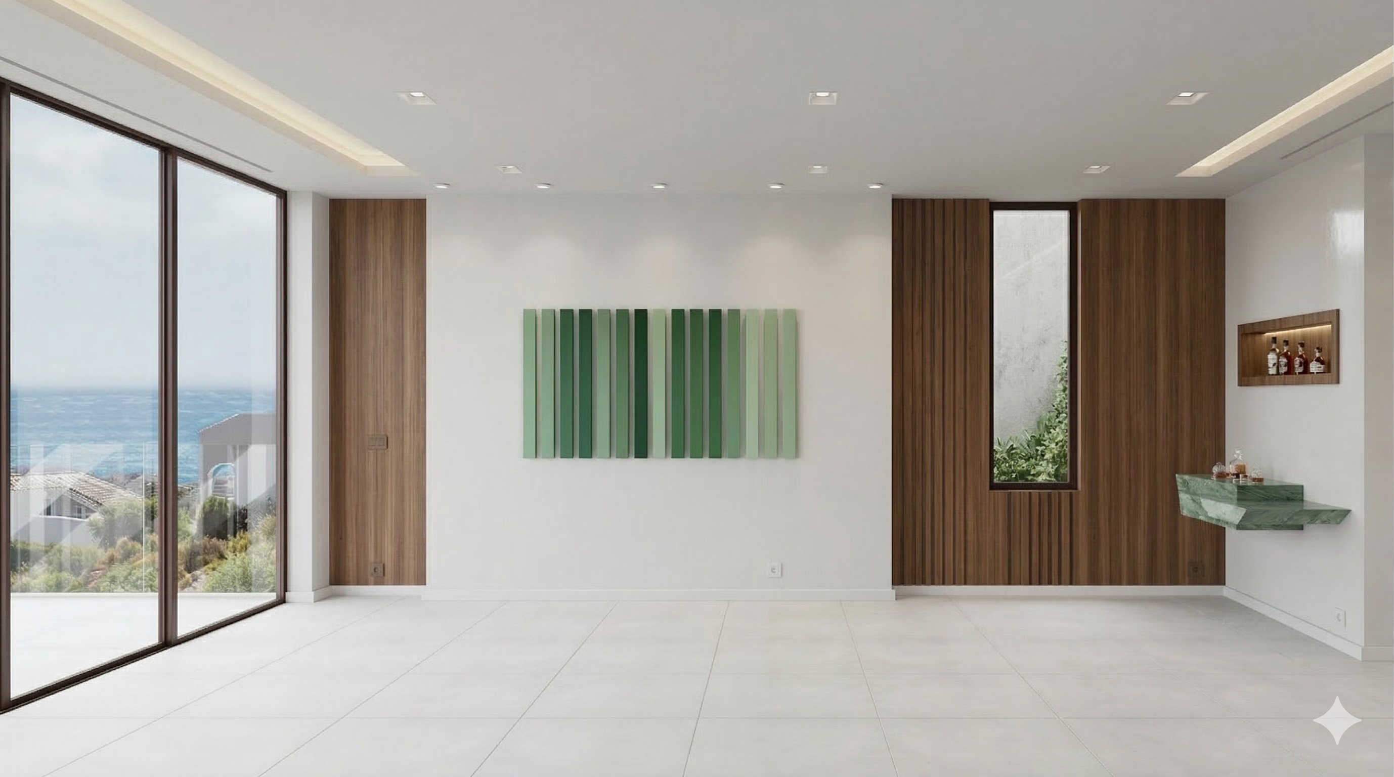enhance into a high resolution 4k photorealistic architectural render strictly preserving the exact geometry orientation no cropping or zooming object placement and general lighting while applying the following detailed enhancements and refinements flooring the entire visible floor area of the interior living room bar and the entire extensive balcony must be paved with a unified high definition surface of large format matte finish white porcelain tiles from the i naturali collection specifically the bianco lasa model featuring subtle grey veining and minimal clean grout lines the tile grid should be clear and distinct across the entire visible floor space resolving the previously low resolution areas bar decor the bar top must be refined remove all previous bottles shakers and generic items place one exquisite fancy elegant crystal decanter filled with whiskey and two matching elegant glasses partially filled with amber whiskey in their place this refined setup is the only decor on the bar top the recessed shelves in the background niche remain as they were with the whiskey bottles artwork on wall the green slatted piece this panel of vertical green slats must be rendered with significantly thinner and sleeker individual wood members than currently depicted creating a more refined and minimalist aesthetic the entire panel of thinner slats must follow a complex and specific mirrored color gradient pattern the color on each individual slat transitions starting from the far left slat the gradient is lightest pale green it progressively deepens across the subsequent eight slats to a rich darkest green in the middle the ninth slat is the darkest and from that point the color pattern perfectly reverses from darkest back to lightest mirroring the order of colors across the first eight slats so that the far right slat is also the lightest pale green creating perfect color symmetry across the entire panel five circular spots the five circular recessed spotlights in the ceiling above the green artwork must be made significantly smaller and more minimal nearly disappearing into the ceiling plane while still casting a refined and focused light preserve all particularities existing geometry and placement of all preserved objects sofa rugs coffee table with book candle side tables large potted plant bar stools wooden console unit and all balcony furniture exactly as they are the entire window wall with existing glazing and glass balustrade structure the background city skyline and natural daylight conditions existing material choices for all non flooring items soda fabric rugs wood metal glass etc do not add any new objects remove anything not specified for refinement bar top clutter and old art form or alter the image framing maintain a precise 4k photorealistic finish