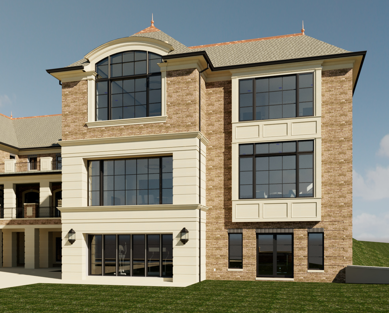 strict image to image architectural rendering do not modify geometry rooflines massing window locations or pool placement maintain exact revit model proportions and structure this is a large scale luxury estate renovation and addition the design must match the existing historic european inspired brick residence shown in reference image material palette match existing house warm multi tone brown tan traditional brick with subtle variation cream limestone trim columns entablatures and belt courses dark bronze black steel windows charcoal dimensional asphalt shingle roof wrought iron railings with classic detailing bronze gutters and downspouts architectural style transitional european estate refined but not overly ornate high end custom home in cincinnati climate zone 5a estate aesthetic brick detailing critical no geometry change enhance the brick soldier course above all windows and doors to read as realistic traditional masonry construction maintain exact alignment and dimensions from the model improve realism through correct vertical brick orientation with consistent spacing subtle mortar joint definition and depth slight color variation within the soldier course no flat color proper shadow line relief to read as a true lintel condition clean crisp alignment with adjacent brick coursing do not thicken stretch or redesign the soldier course realism only no geometry changes lighting soft late afternoon lighting warm architectural uplighting on brick and columns realistic shadow depth photorealistic materials rendering style ultra realistic luxury architectural photography slightly overcast sky high end residential marketing quality