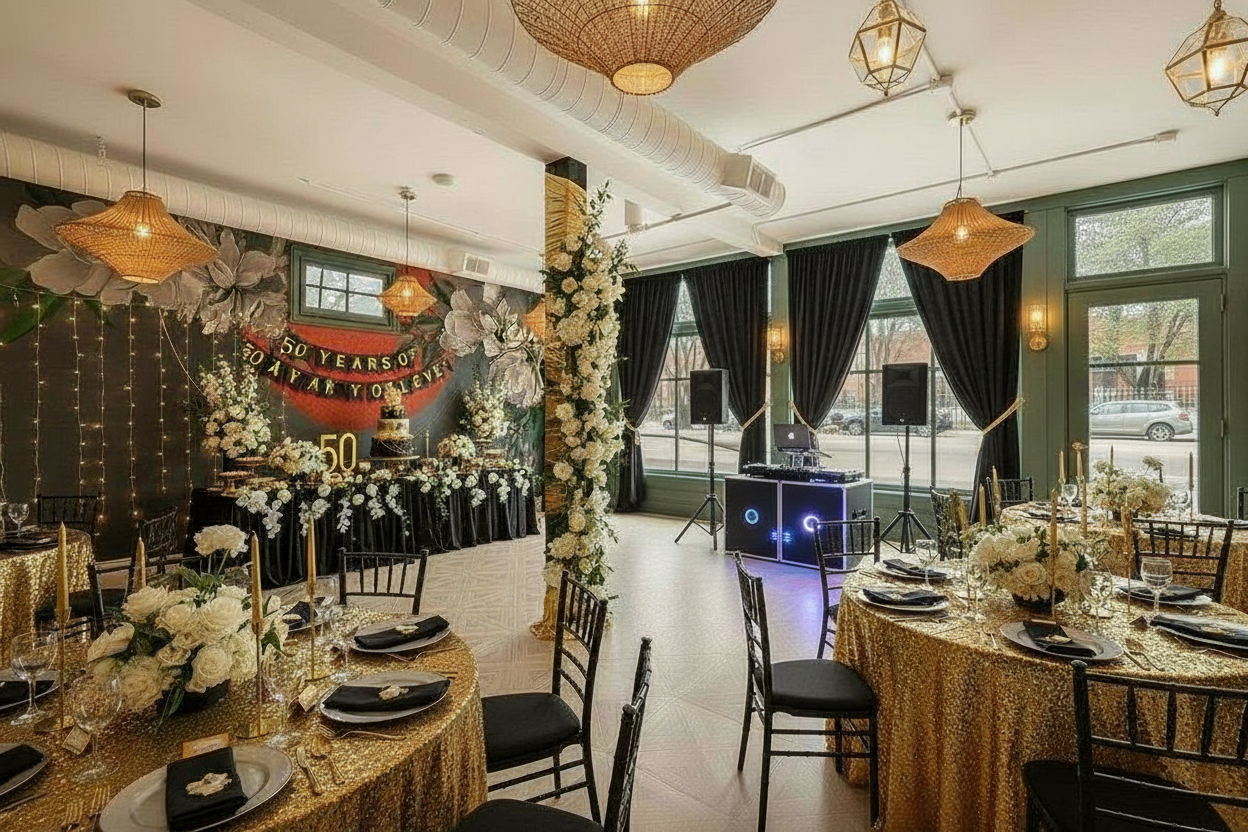 add a banner on the wall that says sam dina 50 year anniversary