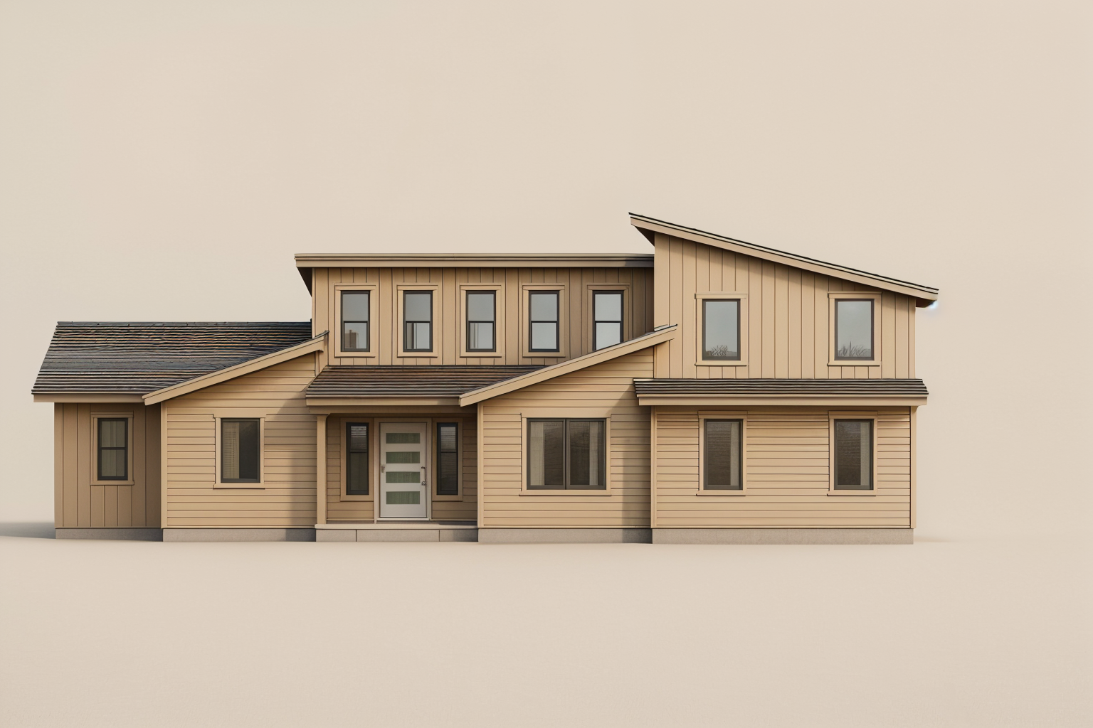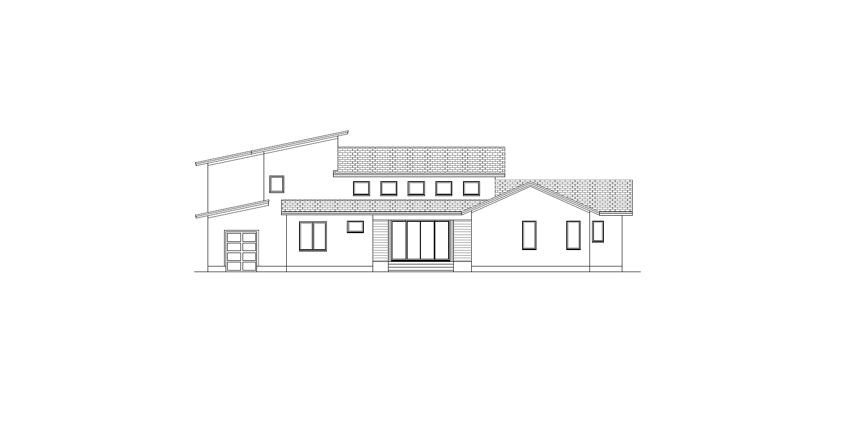 exterior shot rear elevation with dark brown siding gray roofing black trim lush yard